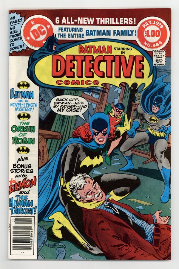 Tags: Giant-Sized Issue, Batman$19.5068-page giant. Cover pencils by Ross Andru, inks by Dick Giordano. "Assault on Olympus!", script by Denny O'Neil, pencils by Don Newton, inks by Dan Adkins; Batman runs a gauntlet of deathtraps in an effort to capture gangboss Maxie Zeus. "The Who is Floyd Fenderman Anyway? Contract!" starring the Human Target, script by Len Wein, art by Dick Giordano. "The Race Against Murder!" script by Jack C. Harris, pencils by Bob Oksner, inks by Vince Colletta; Commissioner Gordon is injured by a mail bomb, and Batgirl sets out to find out who sent it to her father. "The Return of the Flying Graysons!" starring Robin, script by Jack C. Harris, pencils by Kurt Schaffenberger, inks by Frank Chiaramonte. "Tyme Has No Secrets!", script by Len Wein, art by Steve Ditko; The Baron's and the Demon's battle over Merlin's tomb is interrupted by Stavik and the locals. "The Galileo Solution" featuring the Unsolved Cases of the Batman, script by Denny O'Neil, pencils by John Calnan, inks by Frank McLaughlin. Back-cover Batman villains back cover by Jim Aparo. 68 pgs., full color. $1.00. Cover price $1.00.