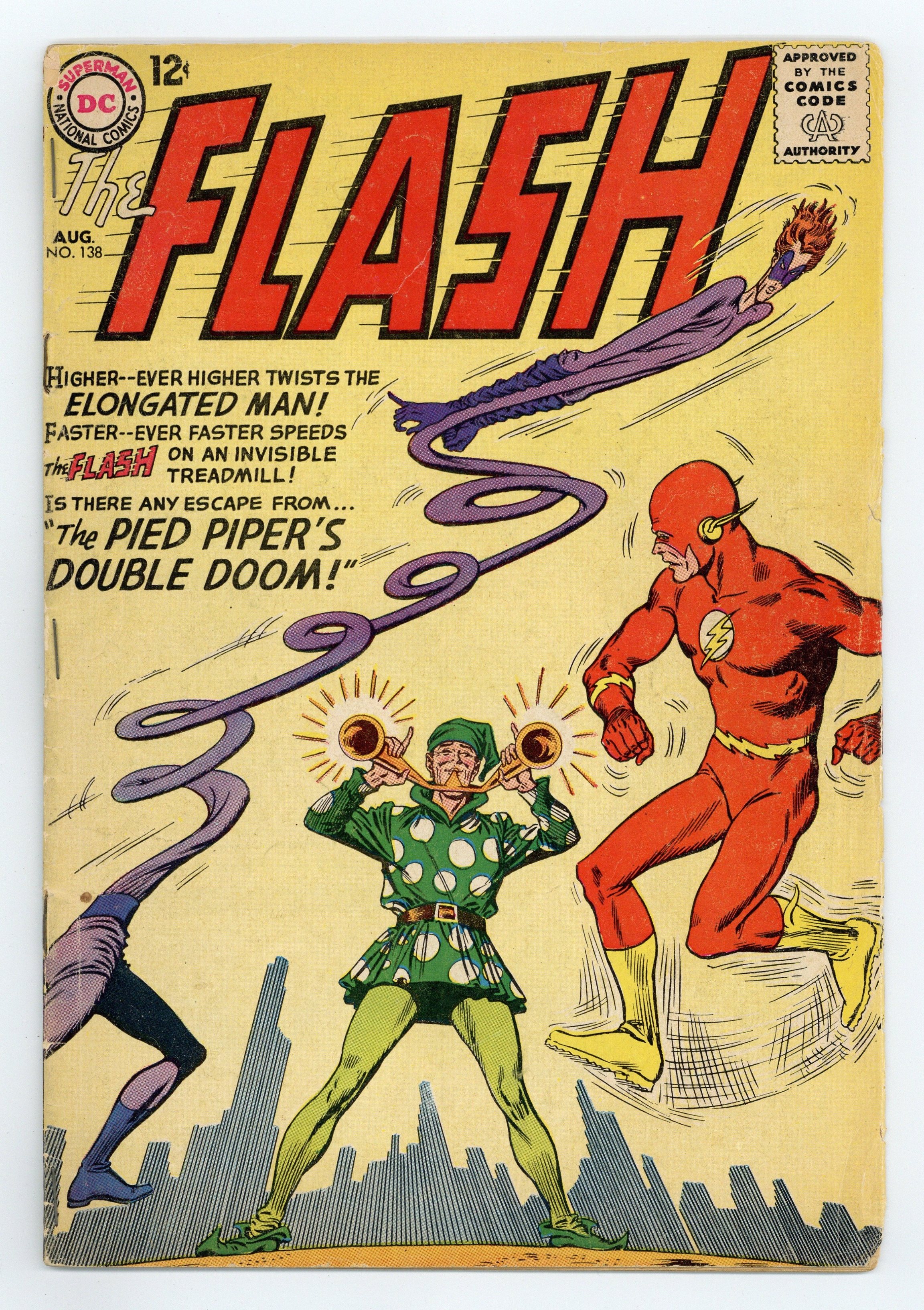 Cover pencils by Carmine Infantino, inks by Murphy Anderson. The Pied Piper's Double Doom!, script by Gardner Fox, pencils by Carmine Infantino, inks by Joe Giella; The Pied Piper uses his musical control to force both The Flash and The Elongated Man to commit robberies and forget they did so, but the heroes meet while trying to solve each others' crimes and realize the Pied Piper is behind the scheme, and defeat him. How NOT To Enjoy A Vacation! public service announcement, script by Jack Schiff, art by Ruben Moreira. Letter from super fan Jerry Bails regarding the relative merits of the current Flash stories vs. the stories from the 1940's. Mystery of the Matinee Idol!, script by John Broome, pencils by Carmine Infantino, inks by Joe Giella; Two crooks try to use Dexter Myles as a diversion to stage a jail break of their comrade, but are foiled by Kid Flash, and Dexter is awarded a spot in the summer festival Playhouse production. A new feature of Kid Flash's new costume appears for the first time; the hair spray used to change his hair from red to brown when appearing as Kid Flash. Intro Dexter Myles, who later becomes curator of the Flash Museum. 36 Pages, Full Color. Cover price $0.12.