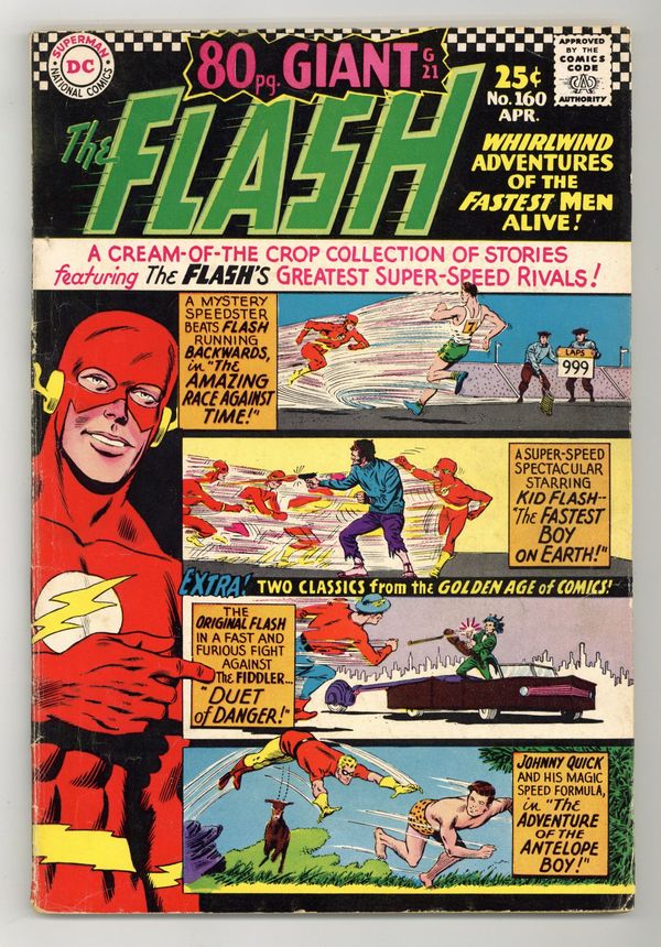 Cover pencils by Carmine Infantino, inks by Murphy Anderson. 80-page Giant G-21. Flash reprints. "The Amazing Race Against Time" (from Flash 107), "Duet of Danger" (from All-Flash 23 in 1948), "Danger in the Air" (from Flash 113), "King of the Beatniks" (from Flash 114), "Space-Boomerang Trap" (from Flash 124), and Johnny Quick in "Adventure of the Antelope Boy" (from Adventure Comics 123 from 1947). Scripts by John Broome, Robert Kanigher. and Don Cameron; pencils by Carmine Infantino, Lee Elias, and Mort Meskin; inks by Joe Giella, Elias, and Meskin. Barry Allen/Flash pin-up (from Flash Annual 1). Grandpa Munster Dragula model kit ad. Letter from noted letter hack Guy H. Lillian III. Atom ad. Justice League ad. Caps Hobby Hints strip by Henry Boltinoff. G.I. Joe Club ad. 84 Pages, Full Color. Cover price $0.25.
