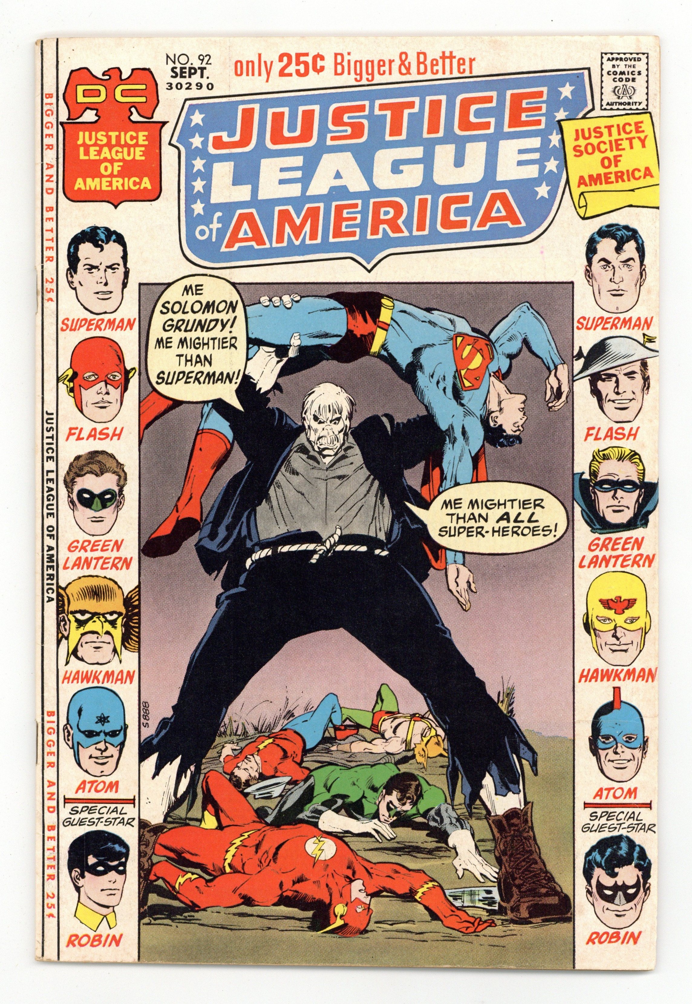 Cover pencils by Neal Adams, inks by Dick Giordano. Solomon Grundy.. The One and Only, script by Mike Friedrich, pencils by Dick Dillin, inks by Joe Giella; As A-Rym meets up with Solomon Grundy on Earth-2, the JLA meets up with the JSA to try and stop A-Rym's rampage; The Earth-2 Hawkman sends both Robins to the batcave to stay out of the way; While there, the Earth-2 Robin gives his Earth-1 doppelganger a new costume to replace his damaged one; Both teams learn that if A-Rym and Teppy aren't reunited soon, they'll both die, and both teams scramble to reunite them, which succeeds. As A-Rym and Teppy return to the other 2 aliens, the aliens' parents scold them for joyriding; Both teams then leave on their separate ways, as Batman awaits for the League to return to aid him on his case as the Earth-1 Robin wonders if he should continue to wear his new costume; Annual JLA-JSA team-up conclusion; story dedicated to Jerry Bails and Roy Thomas. The One-Man Justice League! starring the Flash, script by Gardner Fox, pencils by Carmine Infantino, inks by Joe Giella. Space-Enemy Number One!, script by John Broome, art by Carmine Infantino. 52 pgs. $0.25. Cover price $0.25.