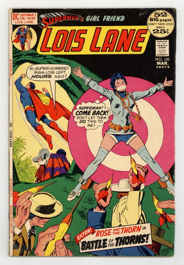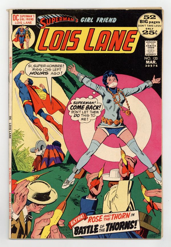 Tags: Superman$30.00Cover art by Dick Giordano. Who Killed Lucy Lane?, script by Cary Bates and Irene Vartanoff (Plot), pencils by Werner Roth, inks by Vince Colletta and Murphy Anderson (Superman heads); Searching for her missing sister Lucy, Lois finds her diary and learns that Lucy was working for the 100 as a spy, stealing secret plans for a super-weapon. Not All Thorns Come from Roses!, script by Robert Kanigher, pencils by Rich Buckler, inks by Mike Esposito; The Thorn encounters a woman wearing duplicates of her costume and weapons, which were created years ago by costume shop owner Arthur Talbot for the woman's mother to use for criminal purposes. Lois Lane - Volunteer Nurse!, art by Kurt Schaffenberger; Lois falls in love with an injured soldier when she volunteers as a nurses' aide, but he turns out to be a member of the 14 Karat Gang. 52 Pages, Full Color. Cover price $0.25.
