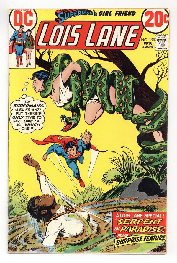 Tags: Superman$22.00Cover art by Bob Oksner. Serpent in Paradise, script by Maxine Fabe, pencils by John Rosenberger, inks by Vince Colletta; Lois and her roommates discover that a guru is really heading a criminal organization. The Million Dollar Night!, pencils by Don Heck, inks by Vince Colletta; Thorn stops some muggers and receives a reward from a reclusive millionaire. 36 Pages, Full Color. Cover price $0.20.