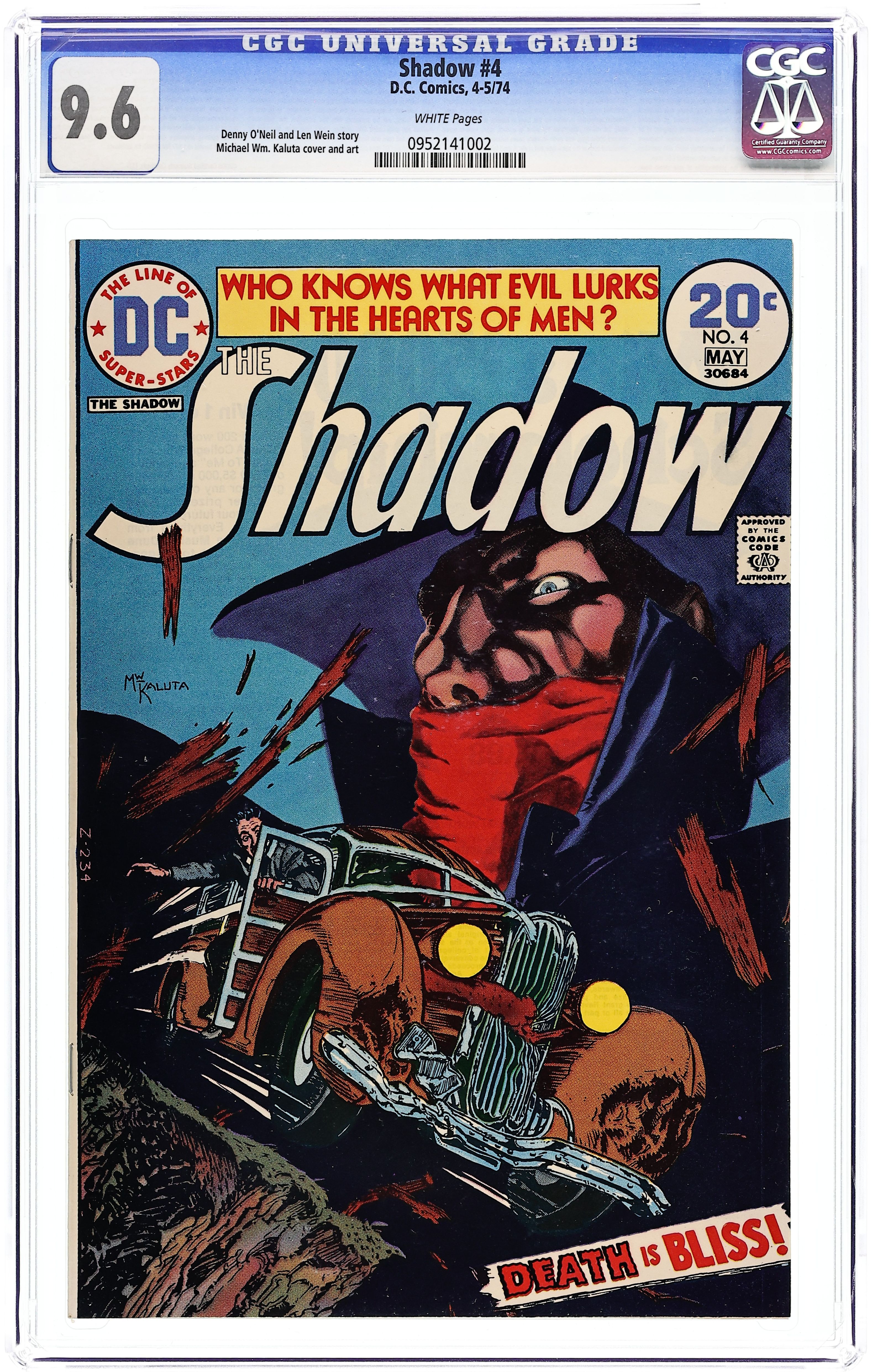 "Death is Bliss." The Shadow's investigation of a bootlegging scheme leads him to criminal bigwig Homer Bliss. Includes letter by writer Arlen Schumer. Script by Denny O'Neil and Len Wein, art by Michael Kaluta. Cover by Kaluta. Cover price $0.20.