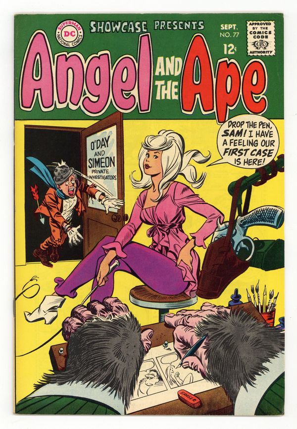 Cover pencils by Bob Oksner, cover idea by Sergio Aragones. 1st appearance of Angel and the Ape in Angel and the Ape, pencils by Bob Oksner, inks by Tex Blaisdell; Trumbull, with his leg in a cast, stumbles into O'DAY AND SIMEON, PRIVATE INVESTIGATORS; Angel is a crack PI and judo master; Sam is a gorilla who draws comic books; Sam delivers his latest art to Stan Bragg, publisher at BRAINPIX PUBLICATION, INC. Angel protects Trumbull from kidnapping, but they're nabbed; continues in Angel and the Ape #1. Ad for Lois Lane #86, an 80-Page Giant. Ad for Enemy Ace in Star Spangled War Stories. One-page "Wonderful World of Comics" text feature reviews Star-Studded Comics fanzine (the great publication by Larry Herndon and mycomocshop.com owner Buddy Saunders) and miscellaneous news. 36 Pages, Full Color. Cover price $0.12.