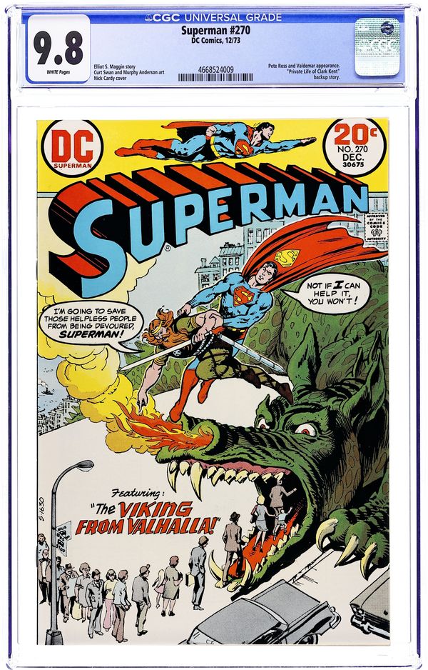 Cover art by Nick Cardy. The Viking from Valhalla! starring Superman, Valdemar, Clark Kent, Oscar Asherman, Steve Lombard, Lois Lane, and Skagerrak, script by Elliot S! Maggin, pencils by Curt Swan, inks by Murphy Anderson. I Can't Go Home Again!--Private Life of Clark Kent, script by Elliot S! Maggin, art by Murphy Anderson; When the plans for a new highway go right through the Kent home in Smallville, Clark returns for one last visit; Pete Ross sees Clark and recalls how he recommended the highway be put through the Kent home to destroy any remaining evidence of Clark's double identity there. 36 Pages, Full Color. Cover price $0.20.