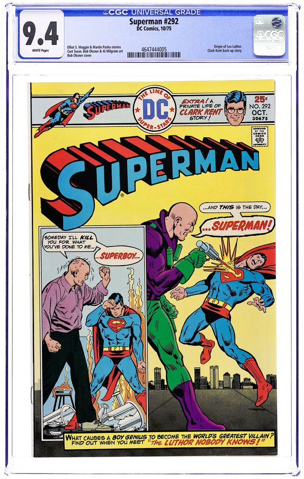 Cover art by Bob Oksner. The Luthor Nobody Knows!, script by Elliot S! Maggin, pencils by Curt Swan, inks by Bob Oksner; Lex Luthor uses a muscle-de-coordinating ray to make Superman destroy Metropolis Airport.; Luthor's origin remembered. I Don't Like Your Face!--The Private Life of Clark Kent, script by Martin Pasko, pencils by Curt Swan, inks by Allen Milgrom; a bully in a bar challenges Clark to a fight. 36 Pages, Full Color. Cover price $0.25.