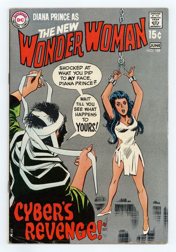 "Cyber's Revenge!" Continued from last issue; continued next issue. Written and pencilled by Mike Sekowsky, with inks by Dick Giordano. Characters: Wonder Woman; Dr. Cyber (villain); Lu Shan; Patrick McGuire. Plus: Diana knocks a common thief who is dumb enough to try to steal her purse and jiu-jitsu's his partner, who's posing as a woman, in the 2-page story "Crime Does Not Pay!" Written and pencilled by Mike Sekowsky. Cover by Mike Sekowsky and Dick Giordano. 36 pages, Full Color. Cover price $0.15.