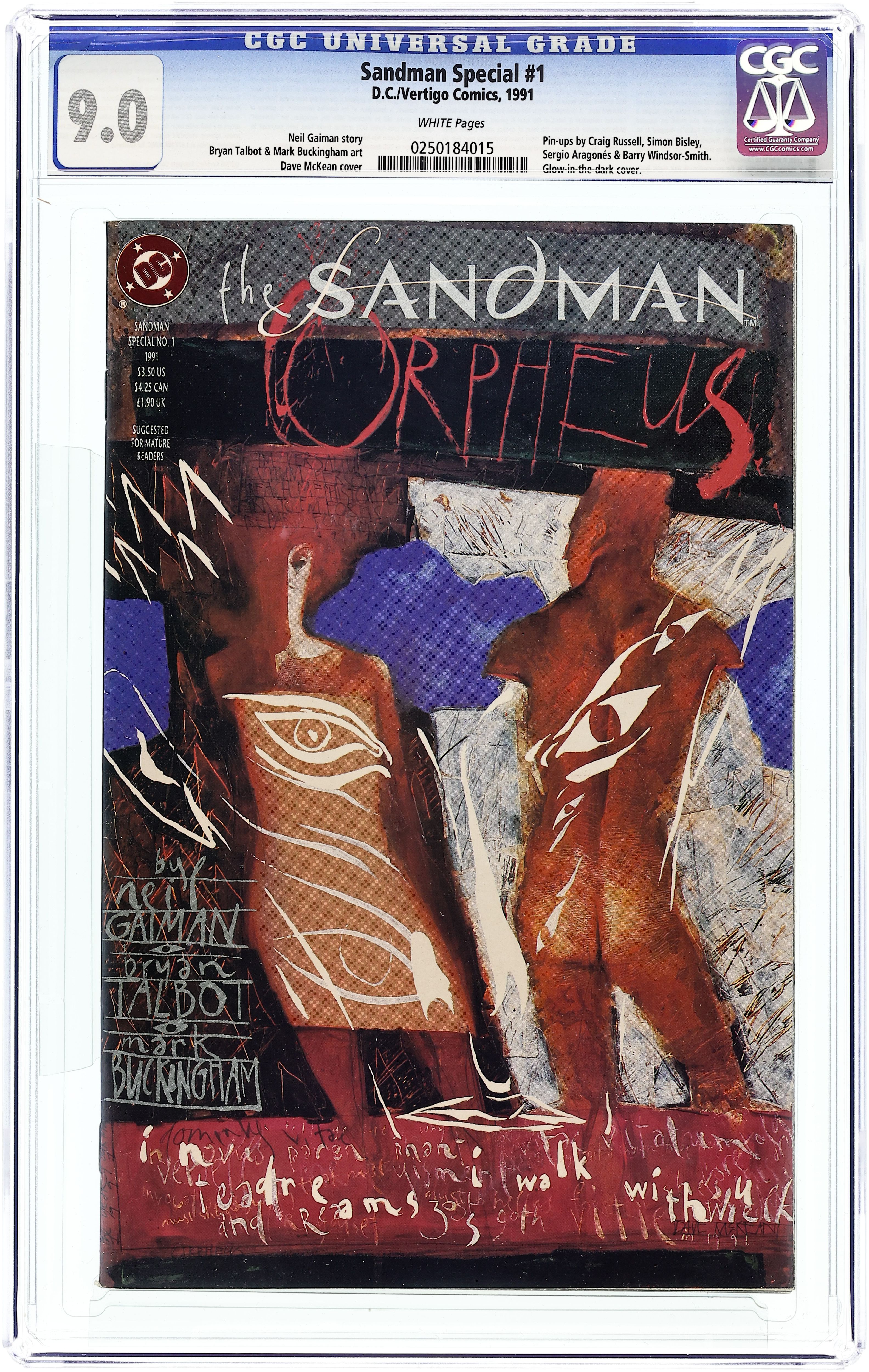 This special reveals the story of Sandman's only child, Orpheus, who went to Hades to bring back his deceased wife, and features (for the first time) the entire Endless family...including the missing brother! Written by Neil Gaiman, with art by Bryan Talbot and Mark Buckingham. Also included is a portrait gallery by some of comics' top artists, including P. Craig Russell, Barry Windsor-Smith, Sergio Aragones, Simon Bisley, Duncan Fegredo, Kent Williams, Tom Canty and Dave McKean. Painted glow-in-the-dark cover by Dave McKean. Suggested for Mature Readers. New Format. Cover price $3.50.