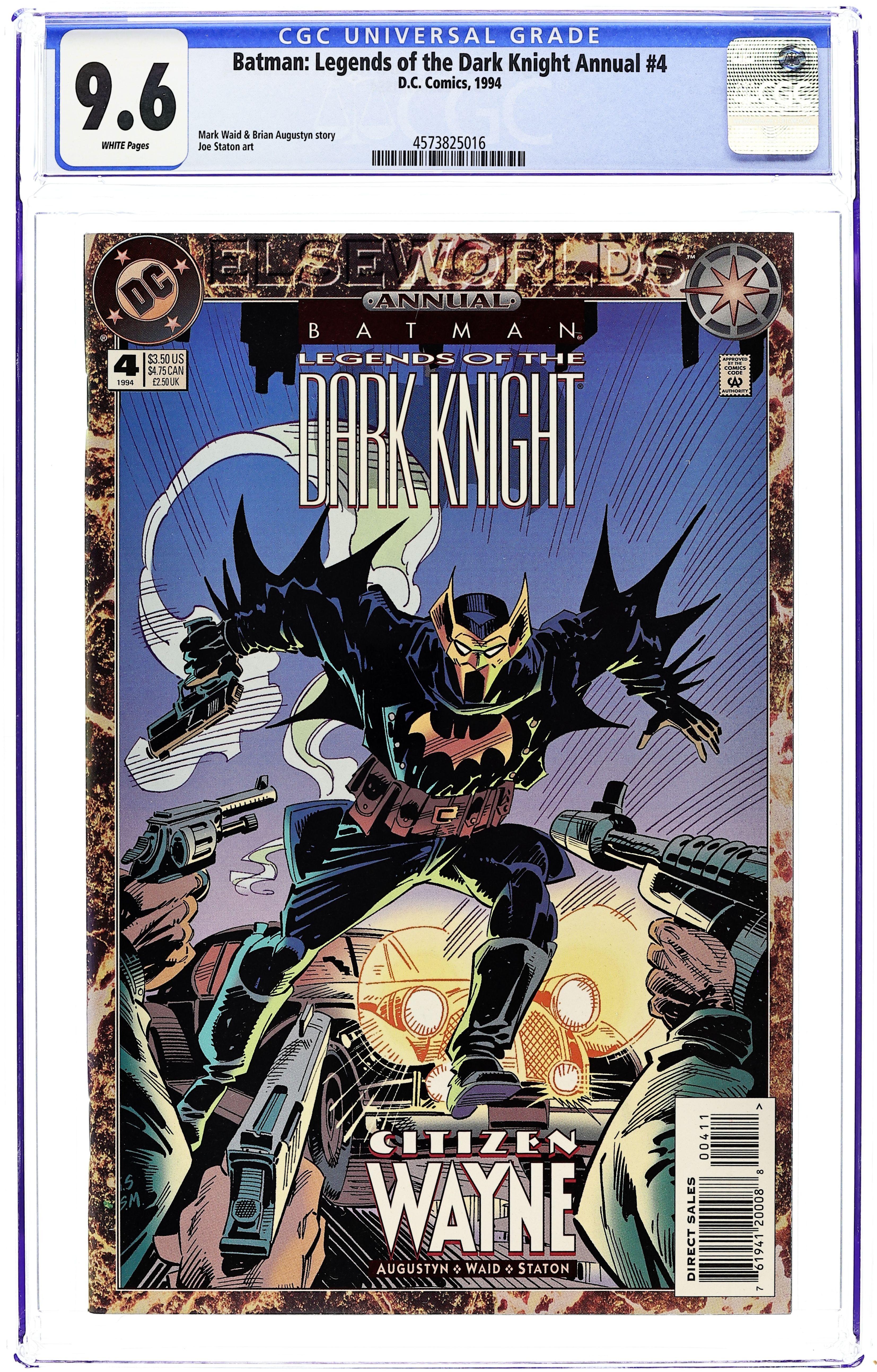 The Elseworlds Annuals, the DC Universe's journey into remote realms of possibility, continue in the Gotham City of the 1930s. Elaborate flashbacks relate, following the discovery of two dead costumed men, the life of millionaire publisher "Citizen Wayne"...a tragic tale of obsession and postponed destiny. An acid attack on Gotham D.A. Harvey Dent turns him into a dark, maniacal avenger, preying on the city's underworld. Bruce Wayne may be the only person capable of stopping him, by becoming the hero he didn't want to be after the murder of his father. Written by Brian Augustyn and Mark Waid, with art by Joe Staton and Horacio Ottolini. Cover by Staton and Steve Mitchell. 68 pages. Deluxe Format. Cover price $3.50.