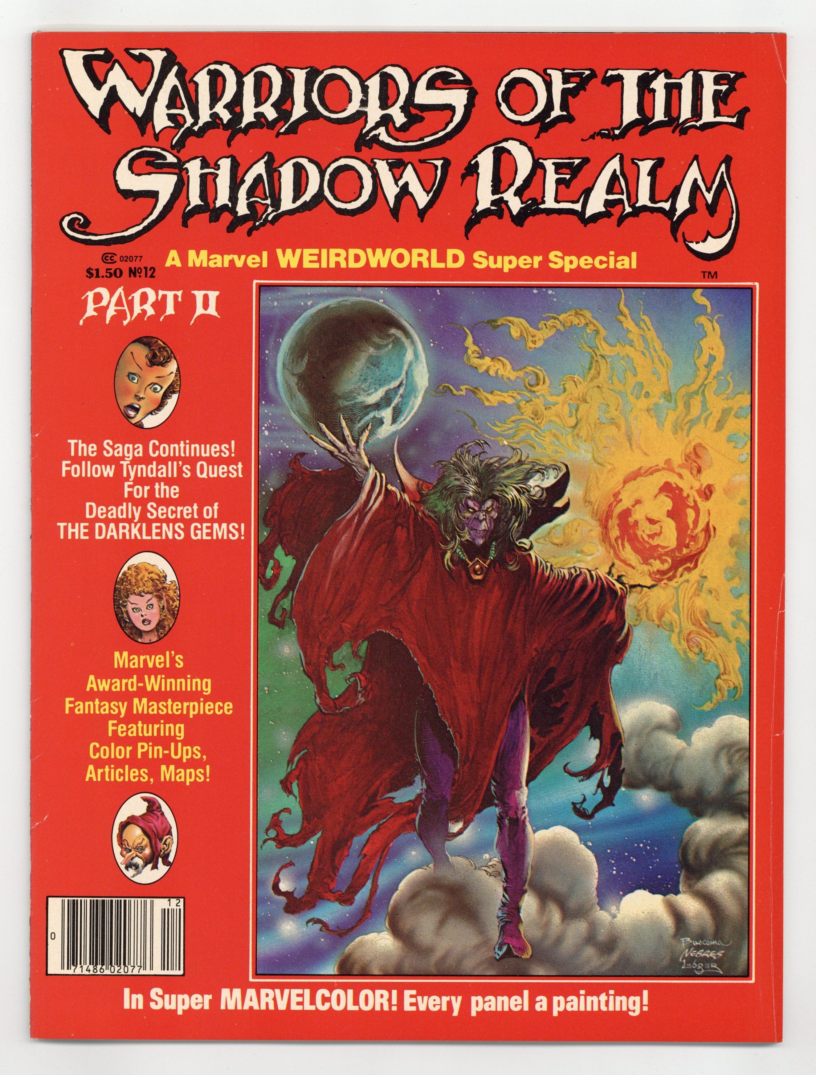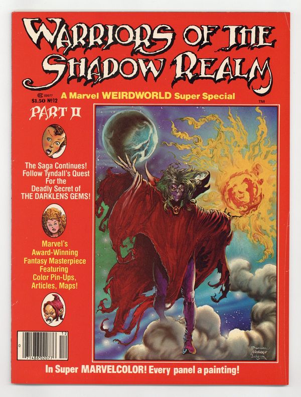 Warriors of the Shadow Realm. Part II of a Weirdworld epic written by Doug Moench, with art by John Buscema, Rudy Nebres and Peter Ledger. Tyndall, Velanna and Mud-Butt encounter a lost race of elves and battle a fallen god. Also includes a history of fantasy illustration by editor Richard Marschall. Full color. Painted cover by Buscema. 52 pages. Cover price $1.50.