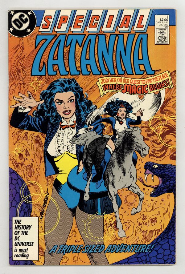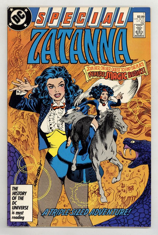 Tags: Zatanna$15.00"Summoning!" Written by Gerry Conway. Art by Gray Morrow. Join Zatanna on her harrowing quest to find the source where magic begins! NOTE: The events of this tale take place before Justice League of America (1960-1987 1st Series) #248-257. 64 pages, FC. NOTE: This Special was originally intended to be a 4-issue mini series but was edited down to one super-sized issue. - Odinson, Lone Star Comics Archivist Cover price $2.00.