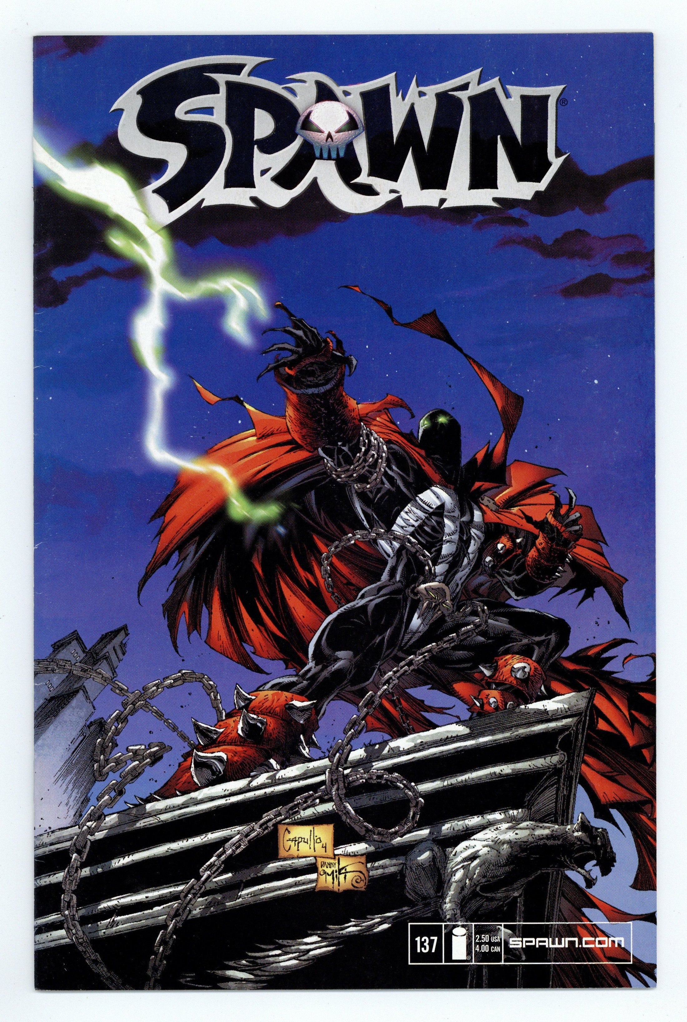 $27.50Direct Edition. (W) Brian Holguin and Todd McFarlane (P) Angel Medina (I) Danny Miki (Cover) Greg Capullo and Todd McFarlane FC. Monthly ongoing series In stores the week of August 27th. THE CONCEPT: Al Simmons, once the U.S. government's greatest soldier and most effective assassin, was mercilessly executed by his own men. Resurrected from the ashes of his own grave in a flawed agreement with the powers of darkness, Simmons is reborn as a creature from the depths of Hell. Disfigured, homeless and alone, this warrior now known as Spawn wanders the shadowy alleys of New York City in search of his past life. THIS ISSUE: "Mad Shadows, Part III." Spawn and Nyx race against time to unravel the mystery surrounding a bizarre rash of brutal murders. All the evidence seems to point to the existence of legendary monsters -- werewolves, zombies, vampires and ghouls -- that emerge from the shadows then disappear without a trace. Convinced that there is a flesh- and-blood face behind all this carnage, Spawn follows the trail to an unlikely and surprising source. 32 pp $2.50 Cover price $2.50.