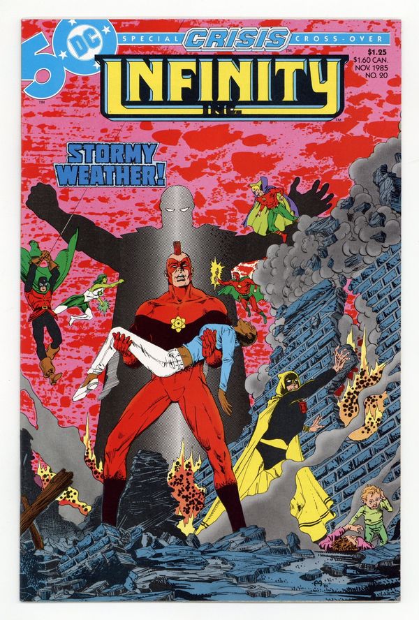 Crisis On Infinite Earths crossover. Nuklon, Dr. Mid-Nite, Hourman and Rick Tyler (Hourman's son) try to save the public after a powerful earthquake in "Crisis On Infinitors' Earth". Script by Roy Thomas, co-plot by Dann Thomas, pencils by Todd McFarlane and Mike Hernandez, inks by Steve Montano. Cover price $1.25.