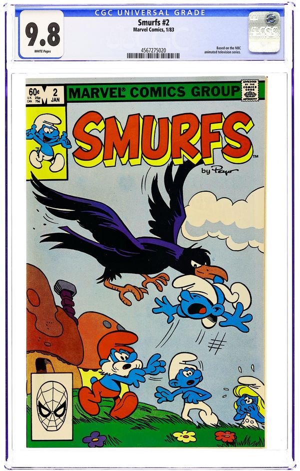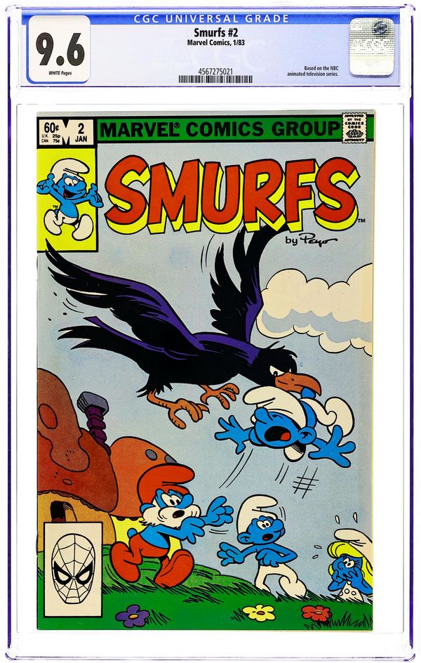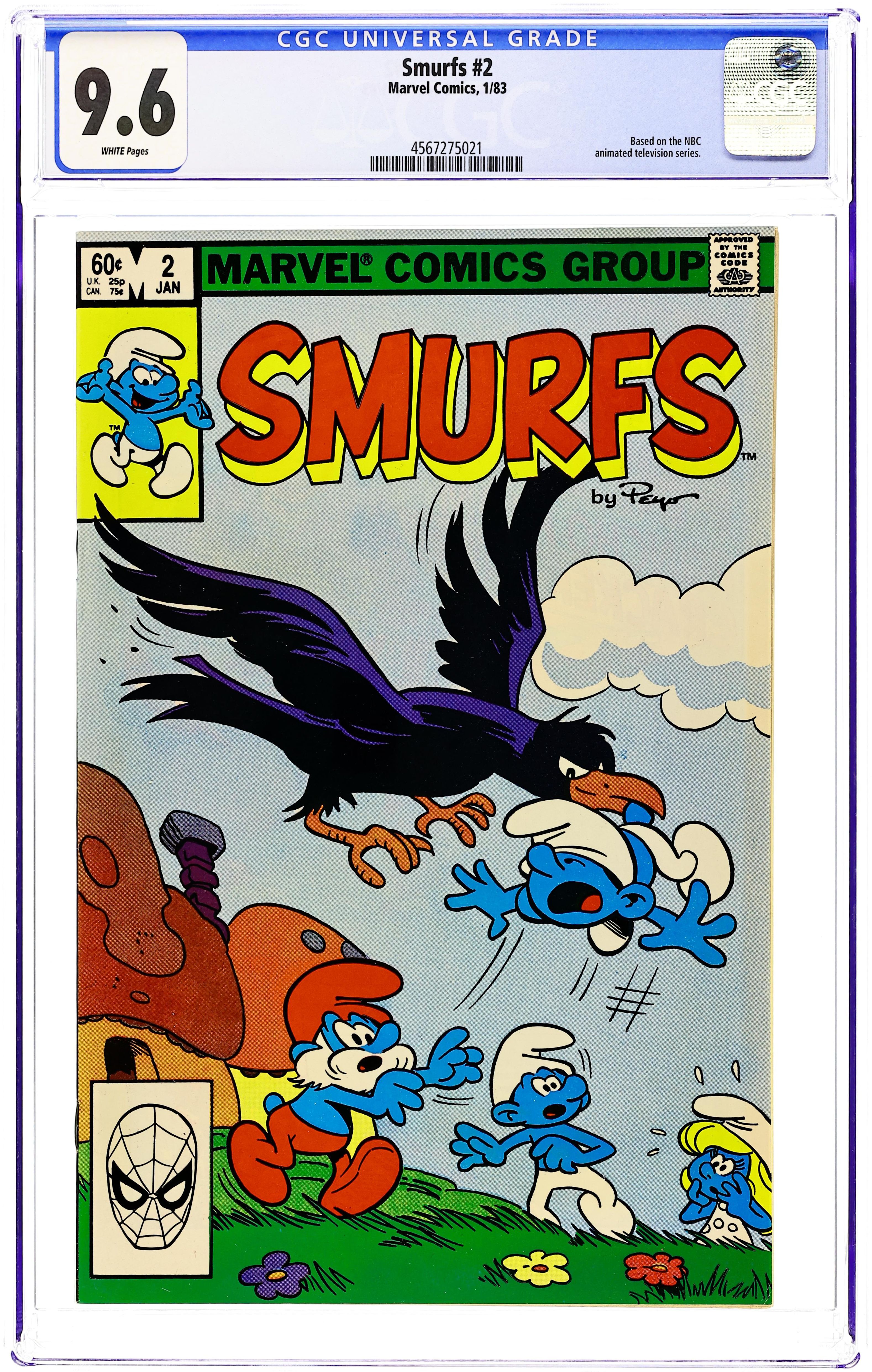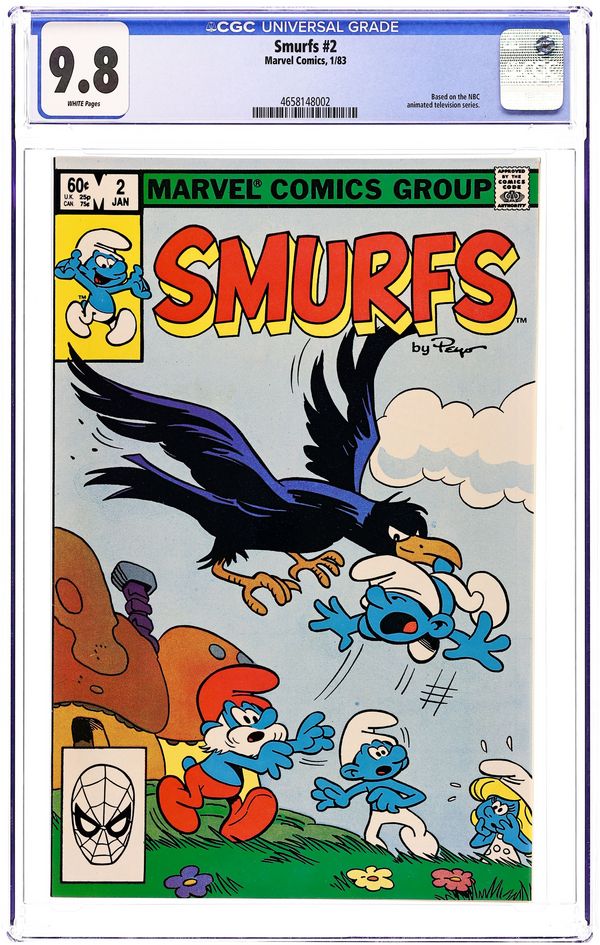 Cover art by Peyo (Pierre Culliford). "The Smurfs and the Evil Bird," art by Peyo (Pierre Culliford); Gargamel creates a potion that turns himself into a bird so that he could infiltrate the Smurf Village; Though he manages to capture a Smurf and fly off with him, the potion wears off, and Gargamel falls to the ground while the Smurf is saved by a stork that was following after them. "Smurf the Birdie!" one-page story, script and art by Peyo (Pierre Culliford). "You're Smurfelous, Too Smurfelous for Birds" one-page story, script and art by Peyo (Pierre Culliford). "Sticky Smurf," script and art by Peyo (Pierre Culliford); Gargamel creates a fake dessert with the intention of trapping a Smurf that touches it, only to find himself trapped in the dessert as well; Papa Smurf creates an antidote that frees the Smurf as well as several other creatures trapped in the dessert, but unfortunately doesn't leave any left to free Gargamel, instead leaving him only with the recipe for the formula for Gargamel to replicate himself. Adaptation of the 1981 Hanna-Barbera TV series based on the characters created by Belgian cartoonist Pierre "Peyo" Culliford (in 1958). 36 pgs., full color. Cover price $0.60.