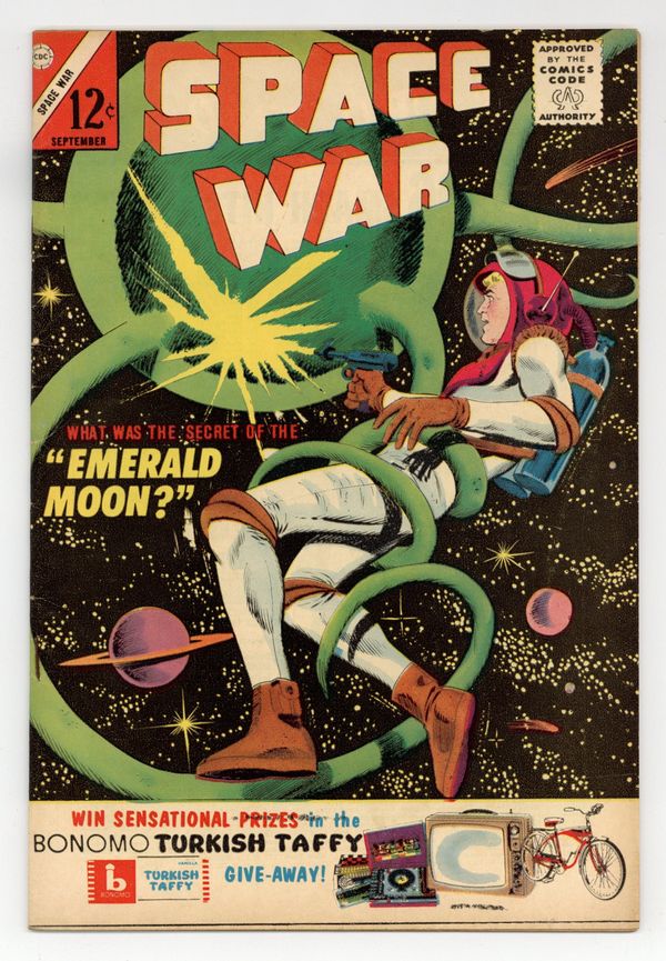 Cover by Dick Giordano. Stories and art by Rocco "Rocke" Mastroserio, Charles Nicholas, Vince Alascia and Bill Molno. Science-fiction tales with twist endings from the dawn of the Space Age. Commander Leeds learns that the "emerald moon" his ship has discovered isn't like other moons, and may not be a moon at all. A dictator seizes Earth's nuclear arsenal and threatens to destroy the other inhabited worlds. And just when it seems the aliens can't get any worse: space mosquitoes. The Emerald Moon; Assault Force; Gift of the Mojii; The Hive Planet; The Ultimate Weapon; E.S.P. 32 pages, Full Color. Cover price $0.12.