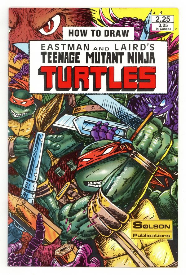 Standard wraparound cover by Kevin Eastman and Peter Laird. Written by Allan J. Fromberg. Art by Kevin Eastman, Peter Laird, and Rich Buckler. One of a series of how-to art books from Solson, the company run by the son of Marvel comics veteran Sol Brodsky. This volume features step-by-step instructions and illustrated examples of how to draw the Teenage Mutant Ninja Turtles, using sketches and pinups drawn by Turtle co-creators Kevin B. Eastman and Peter Laird. Includes weaponry; turtle heads, hands, and feet; action scenes; motion; facial expressions; and even the proper way to draw turtle teeth and shells. Published during the height of the first wave of Turtlemania in comics. 32 pages, B&W. Cover price $2.25.