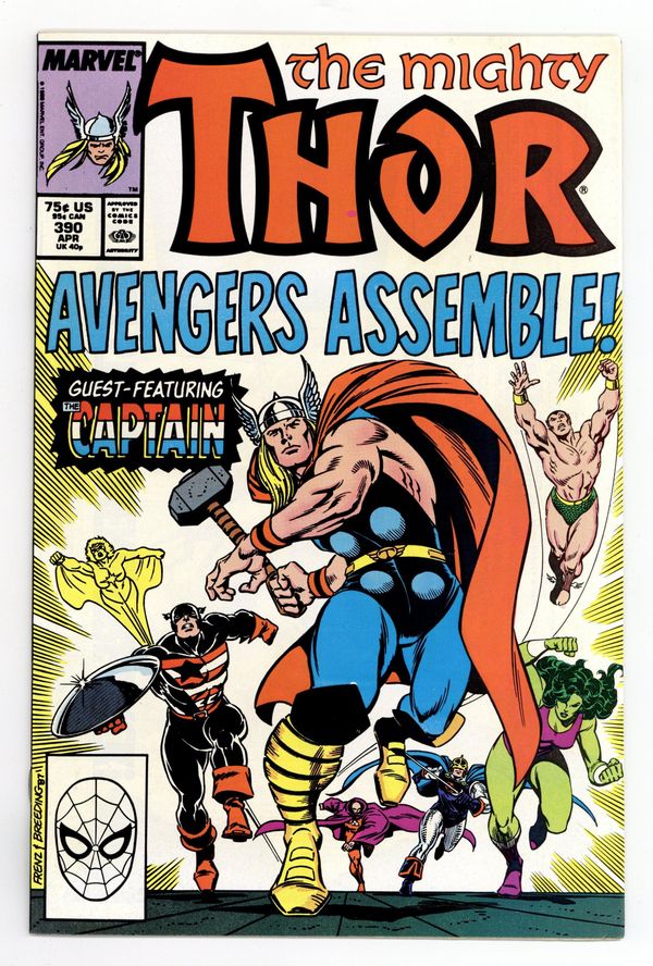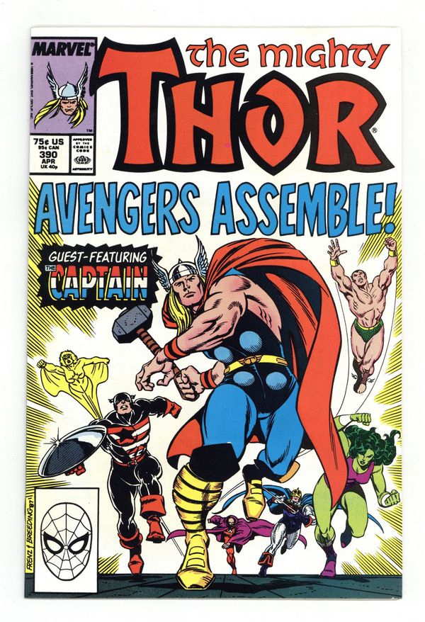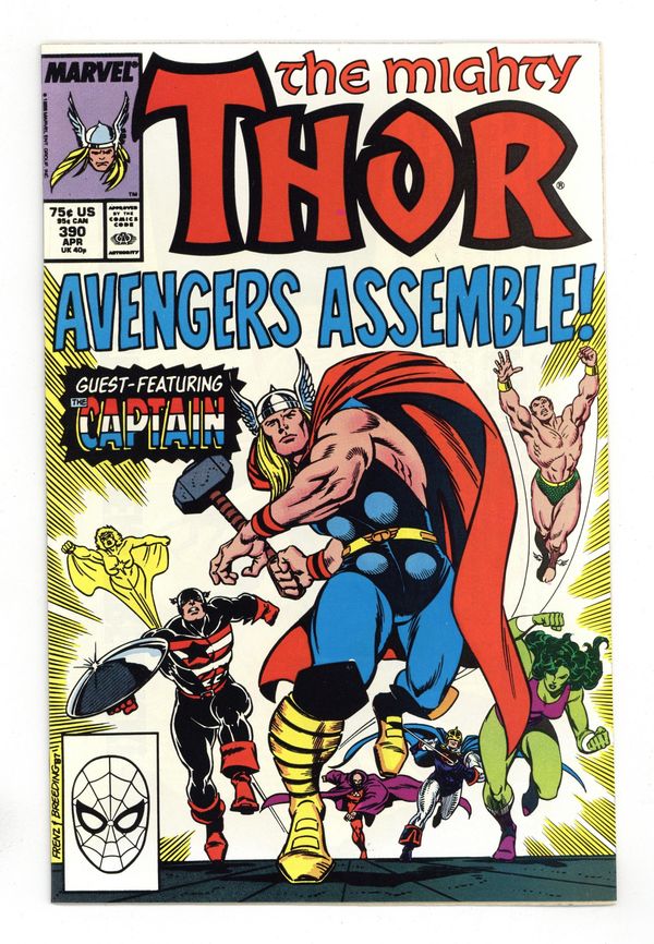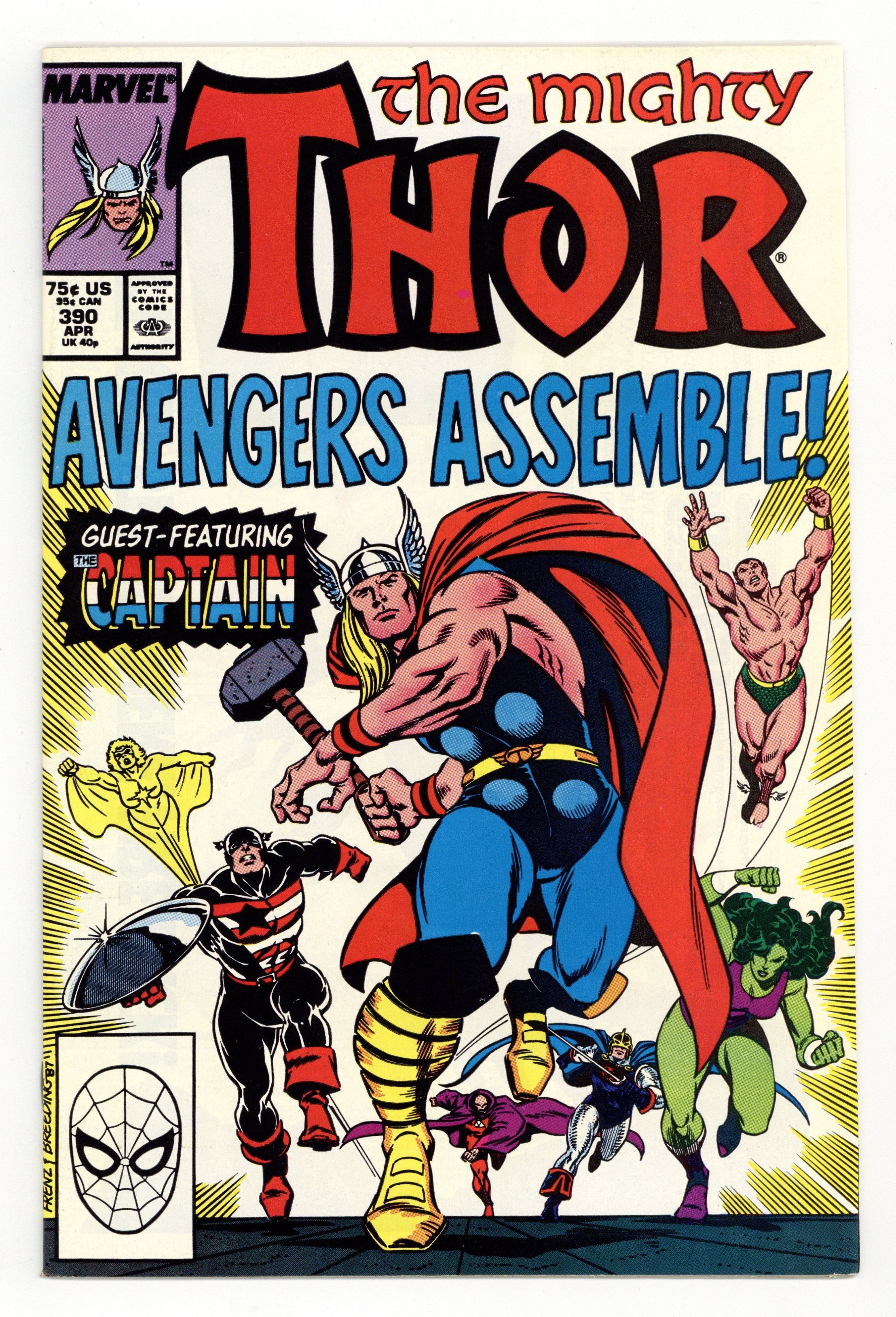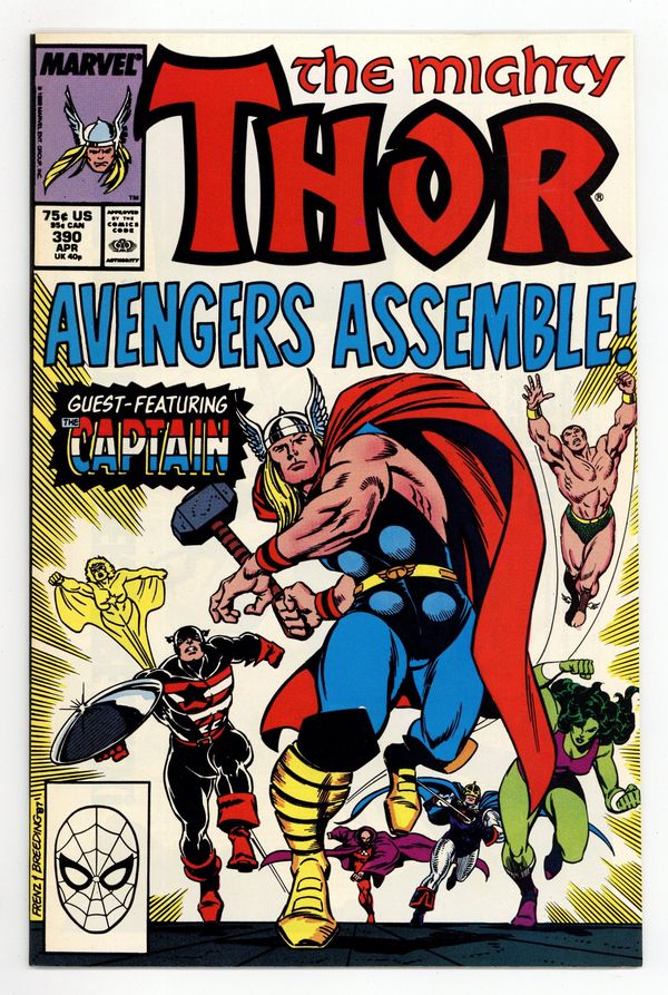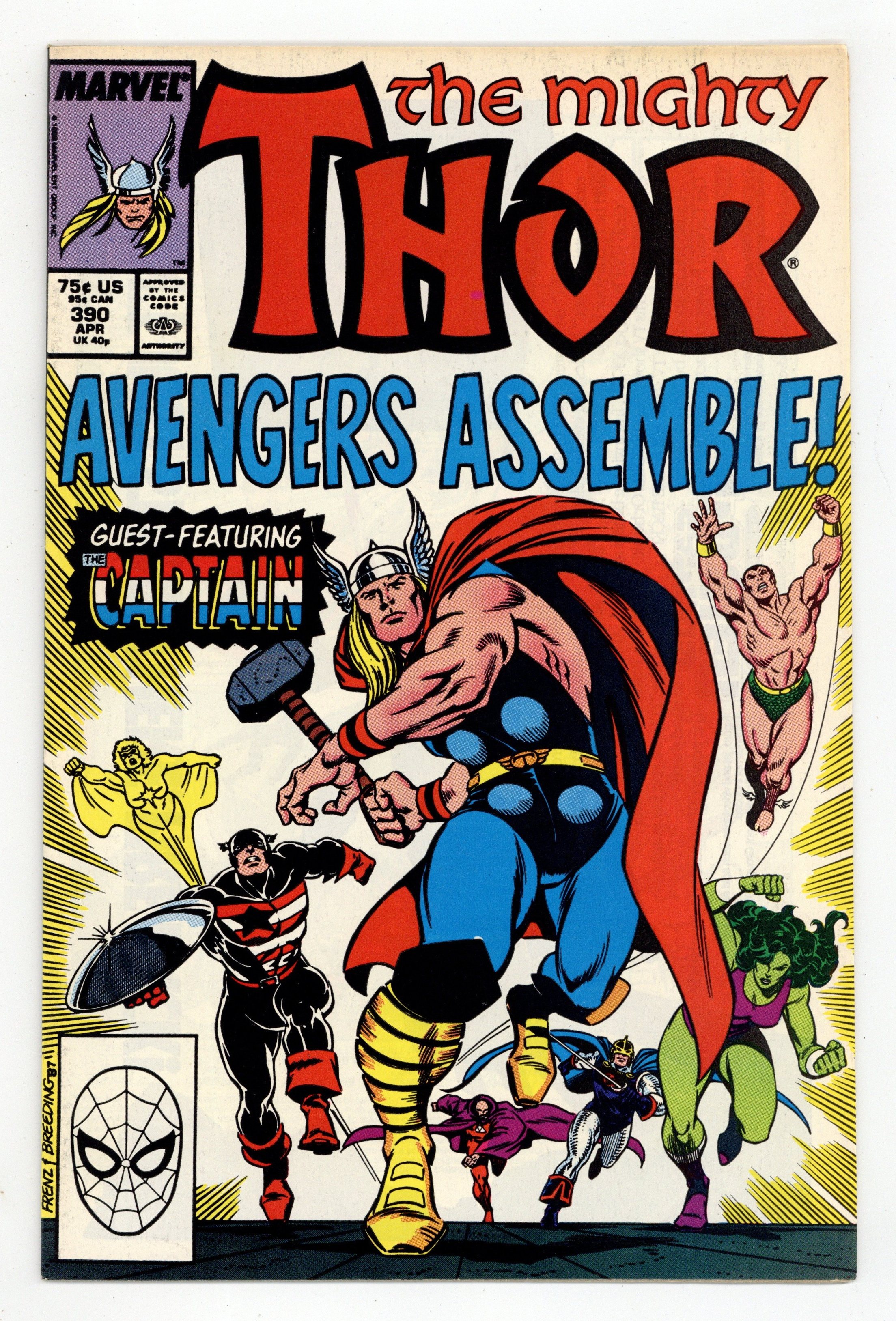 War of Gods: Prelude - The Avengers guest star in "The Hero and the Hammer!", script by Tom DeFalco, pencils by Ron Frenz, inks by Brett Breeding; Thor arrives on Hydrobase, and learns of the many changes to the Avengers; Asgard is once again attacked by Seths legions, while Grog and more Demons of Death attack Thor and the Captain; During the battle, the Captain lifts Mjolnir and sends it back to Thors grasp; Thor then easily defeats Grog and the soldiers, sending them back through the gate. Brief appearances by Hogun, Fandrall, Volstagg, and Balder. The letters page contains a statement of ownership: average print run 314,440; average paid circulation 190,600. 36 pgs., full color.