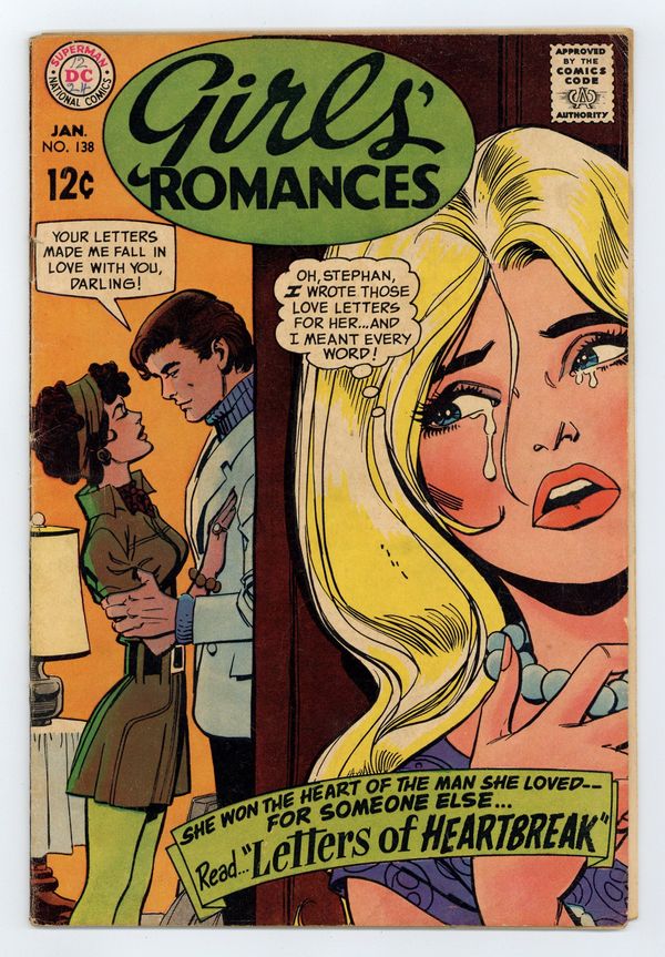 She won the heart of the man she loved -- for someone else! "Letters of Heartbreak" is the cover-featured 8 page story drawn by Win Mortimer? and Vince Colletta? Plus: 5 page story "Love from a Stranger" pencilled by Tony Abruzzo; 9 page story "Romance Without Love" drawn by John Celardo and Bernard Sachs; 1 page Julia Roberts, Romance Counselor letters page (with logo illustration pencilled by Bob Oksner); 2 page Mad Mad Modes for Moderns filler pencilled by Jay Scott Pike; 7 page story "Bring Me Your Heart" pencilled by John Forte? Cover price $0.12.