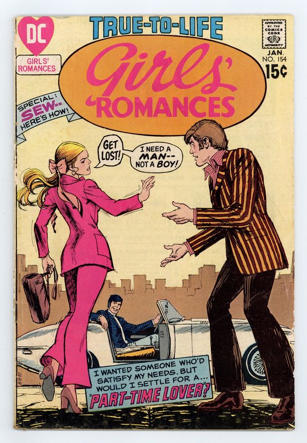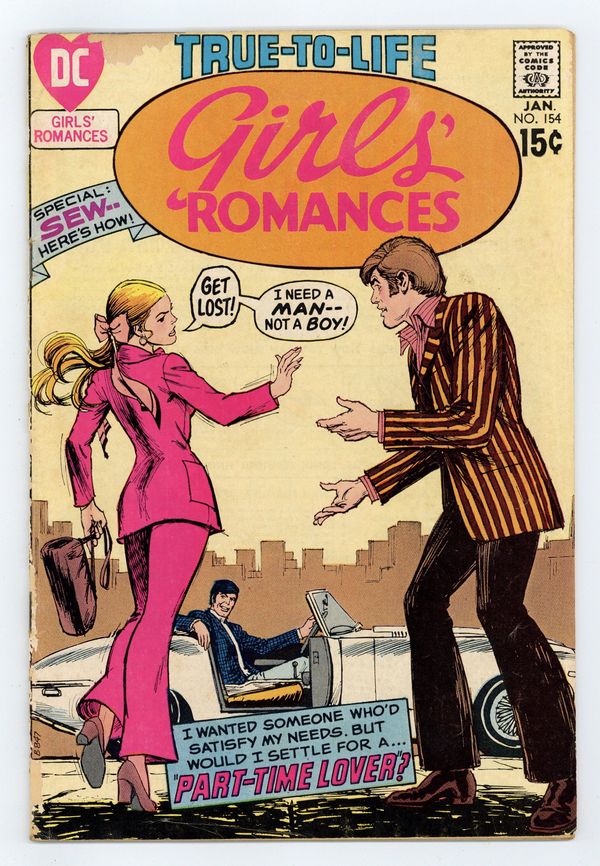 Cover art by Nick Cardy. The Girl Who Gave Her Love Away!; Freshman Sandy is ecstatic when senior Allan takes an interest in her, but her friends all warn her about his reputation as a lady-killer. House ad for Super DC Giant #S-21, art by Charlie Armentano. Untitled Betty's Boutique story, pencils by George Tuska; Betty models several new outfits for two customers, but she mistakes which one is really doing the shopping. A Kiss from a Stranger, pencils by Arthur Peddy, inks by Bernard Sachs; A guy meets a girl on the beach and they share a romantic moment, but she runs away. Part-Time Lover, pencils by Art Saaf; Randy is bored with her boyfriend Chuck so she dumps him when she meets Myles, who takes an immediate interest in her. . Julia Roberts Romance Counselor advice column. 36 pgs. $0.15. Cover price $0.15.