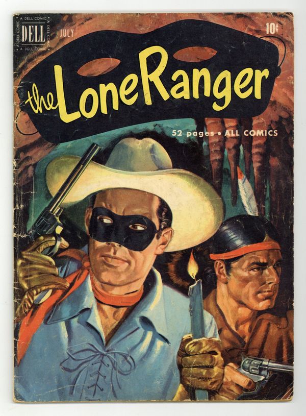 $35.50BLUE SHIRT. Painted cover art. Facts about cowboy boots. The Crooked Gambler, art by Charles Flanders; Bolo Sherman's father cheats at poker and is killed by one of the men he cheated; He moves to a different town and needs the Lone Ranger's help to keep a thug from forcing his sweetheart's father to buy crooked gambling equipment. The Gold Mine Stock, art by Charles Flanders; Duped settlers take out 60-day mortgages to buy stock in a fake gold mine, and lose their property when they can't pay the mortgage. Wolf Brothers Hunting text story, script by Gaylord Du Bois, art by Jon Small. The City of the Sun, script by Gaylord Du Bois, art by Jon Small; Young Hawk and Little Buck return from a hunting trip to find their captive Black Dog has been killed when he stole a canoe from an old Natchez Indian named High Cloud. Based on the popular Western TV series. 52 pages, full color. Cover price $0.10.