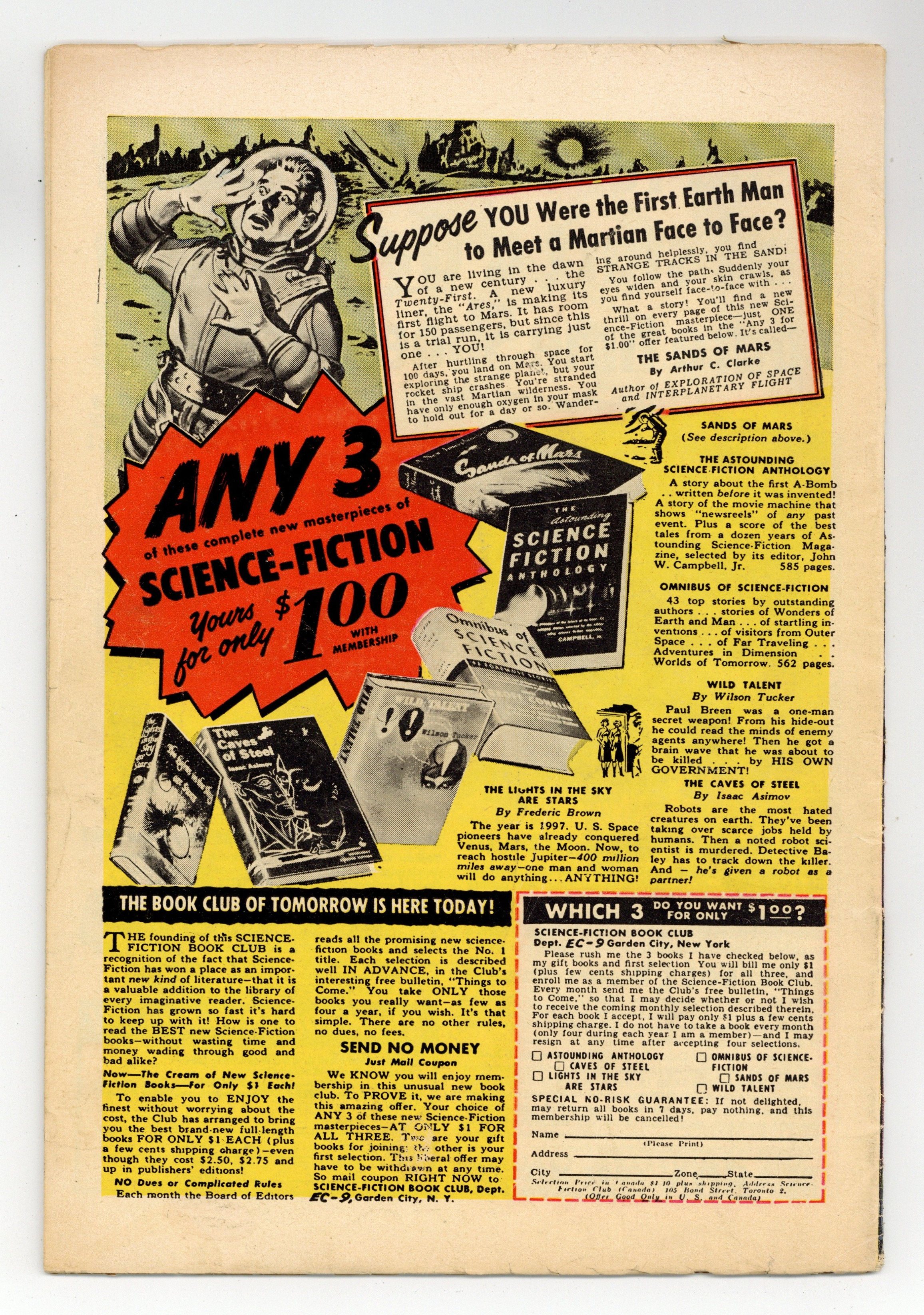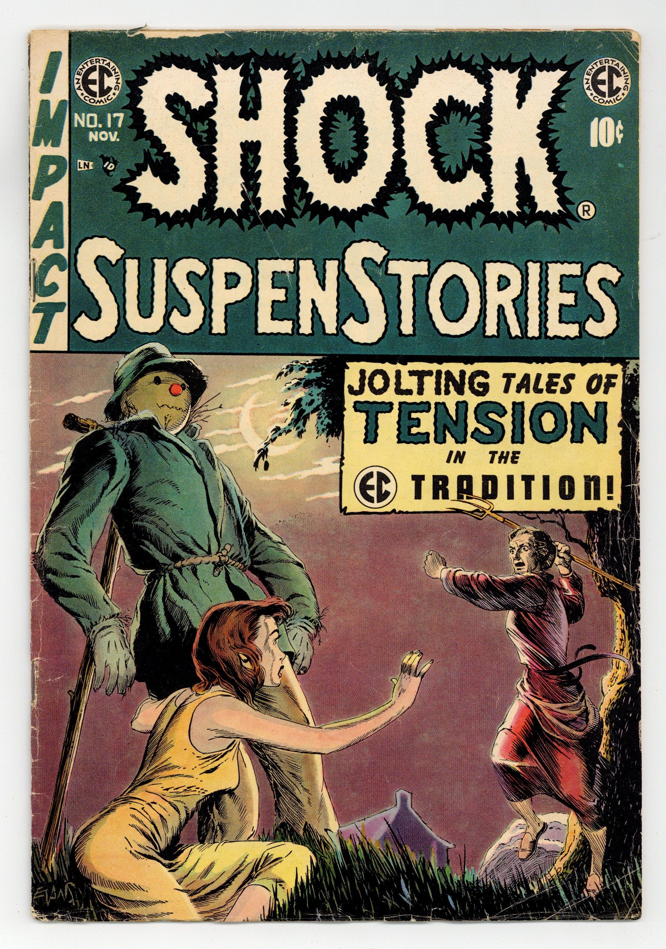 Cover art by George Evans. 4-Sided Triangle, script by Carl Wessler, art by Jack Kamen; A farmer tries to molest a retarded girl he keeps to work on the farm as a servant; She tells him that she's got a boyfriend that she sees in the evening. In Character, script by Albert B. Feldstein, art by Reed Crandall; Boris Karloff murders all of his Hollywood contacts after he has been typecast in pictures. Timetable text story by Albert B. Feldstein. The Assassin, script by Carl Wessler, art by George Evans; An assassin unknowingly pursues his mark backstage of a theater and kills the man just before the curtain rises. The Operation, script by Albert B. Feldstein, art by Joe Orlando; A diamond thief surgeon cuts open his two goons to smuggle diamonds into the country in their bodies. Letter to the editor from E. Nelson Bridwell. 36 pgs. $0.10. Cover price $0.10.