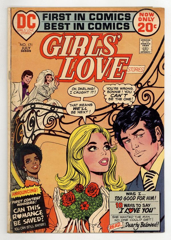 Featuring: 13 page story "Too Good for Him" pencilled by Jay Scott Pike; 1 page text article "Can This Romance Be Saved?"; 5 page story "Dearly Beloved" pencilled by Art Saaf; 6 page story "No Boys Allowed"; 1 page text article "Ten Ways to Tell Him You Love Him." Cover price $0.20.