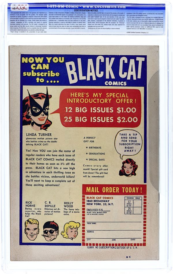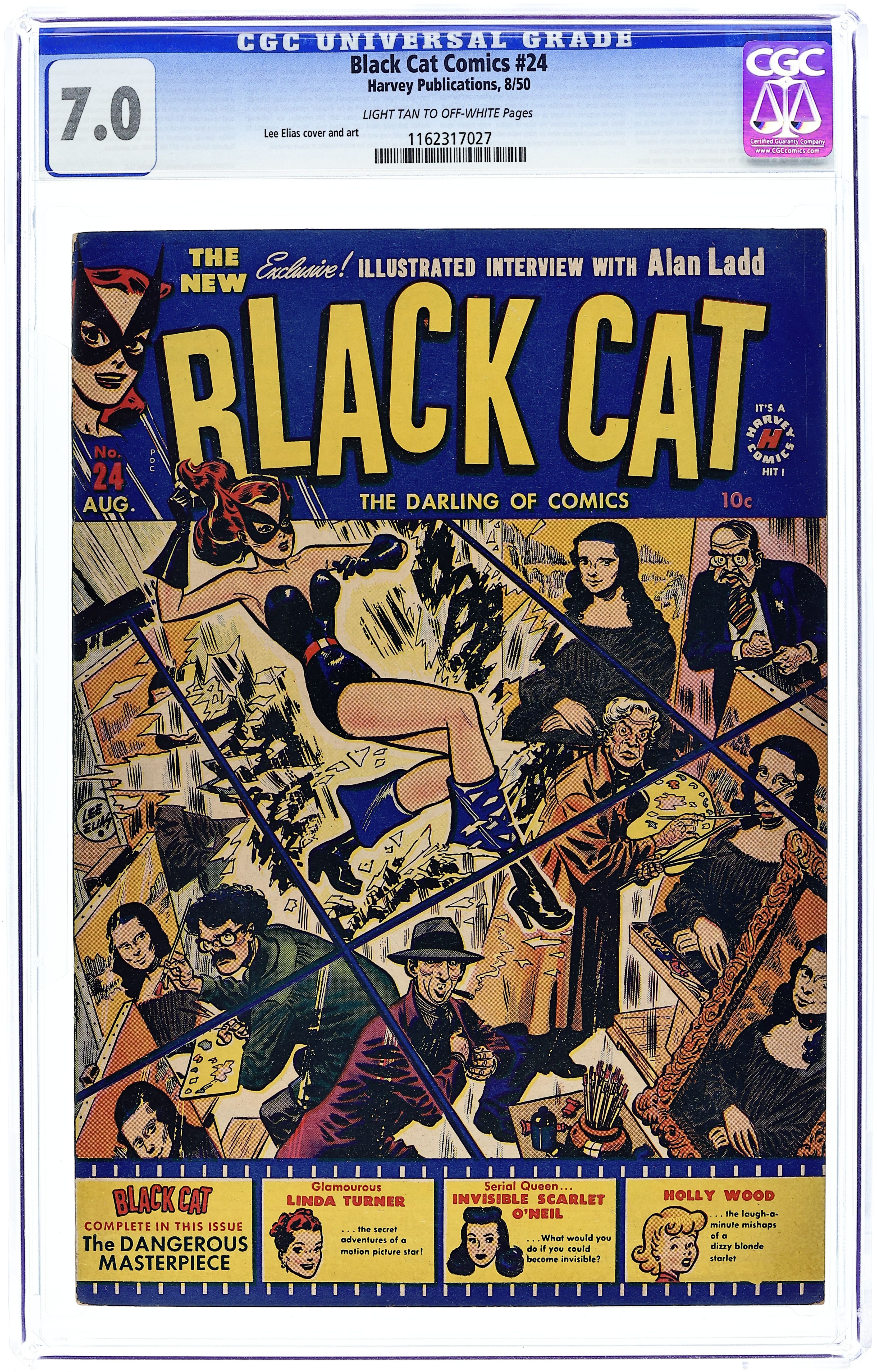 Edited by Leon Harvey. Cover by Lee Elias. Stories by Bob Haney, Lee Elias, and Russell Stamm. The Black Cat in "The Dangerous Masterpiece!" Back-up stories "A Day with Linda Turner" and the Invisible Scarlet O'Neil. One-page Tootsie Roll ad, "Captain Tootsie the Rain maker" by Bill Schreiber. Mystery, adventure, and humor tales starring such characters as Linda Turner, Invisible Scarlet O'Neill, and the Black Cat, an action hero and skilled martial artist who uses a lasso and rope. Alan Ladd bio. 36 pages, full color. Cover price $0.10.
