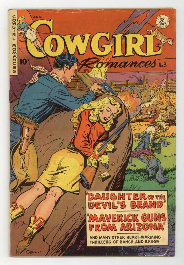Art by Jack Kamen and others. Tender tales of romance among the cowhands and roughnecks of the Old West. Outlaw Dawn just wants justice for her father, but her lawless band takes it too far. Sheriff Carter helps Mary defend her family ranch against banditos. Handsome rancher Bob Bennett is torn between Rose, who saved his life, and the mysterious woman who's rustling his cattle. The cover promises "heart-warming thrillers of ranch and range." Daughter of the Devils Brand; Maverick Guns from Arizona; Calamity Jane; Gambling Queen of Eldorado! 52 pages, Full Color. Cover price $0.10.
