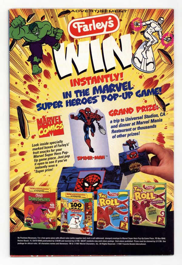 $43.00Cover pencils by Tom Lyle, inks by Bud LaRosa. "The Carnage Cosmic," script by Tom DeFalco, pencils by Joe Bennett, inks by Bud LaRosa; Silver Surfer takes to space to fight the symbiote without harming innocents, leaving Spider-Man to assist the helpless Cletus Kasady; Martha Robertson is treated for her arm wound and condemns Robbie for thinking like a newsman instead of a concerned husband; Spidey brings Cletus to the same hospital, where it's discovered the symbiote was keeping his stomach cancer at bay; Escaping police capture and bystanders trying to collect the Bugle's bounty, Spidey decides to let the world deal with a symbiote-possessed Surfer without him until he sees the Surfer heading towards the hospital to restore the symbiote to Kasady; Spidey tries to stop him until Surfer convinces him otherwise; Carnage is restored, but the Surfer encases him in an ethereal energy shell so he can't harm anyone. Later, at the Bugle, Robbie hands Jonah his resignation. Galactus cameo. 38 pgs., full color. $1.99. Cover price $1.99.