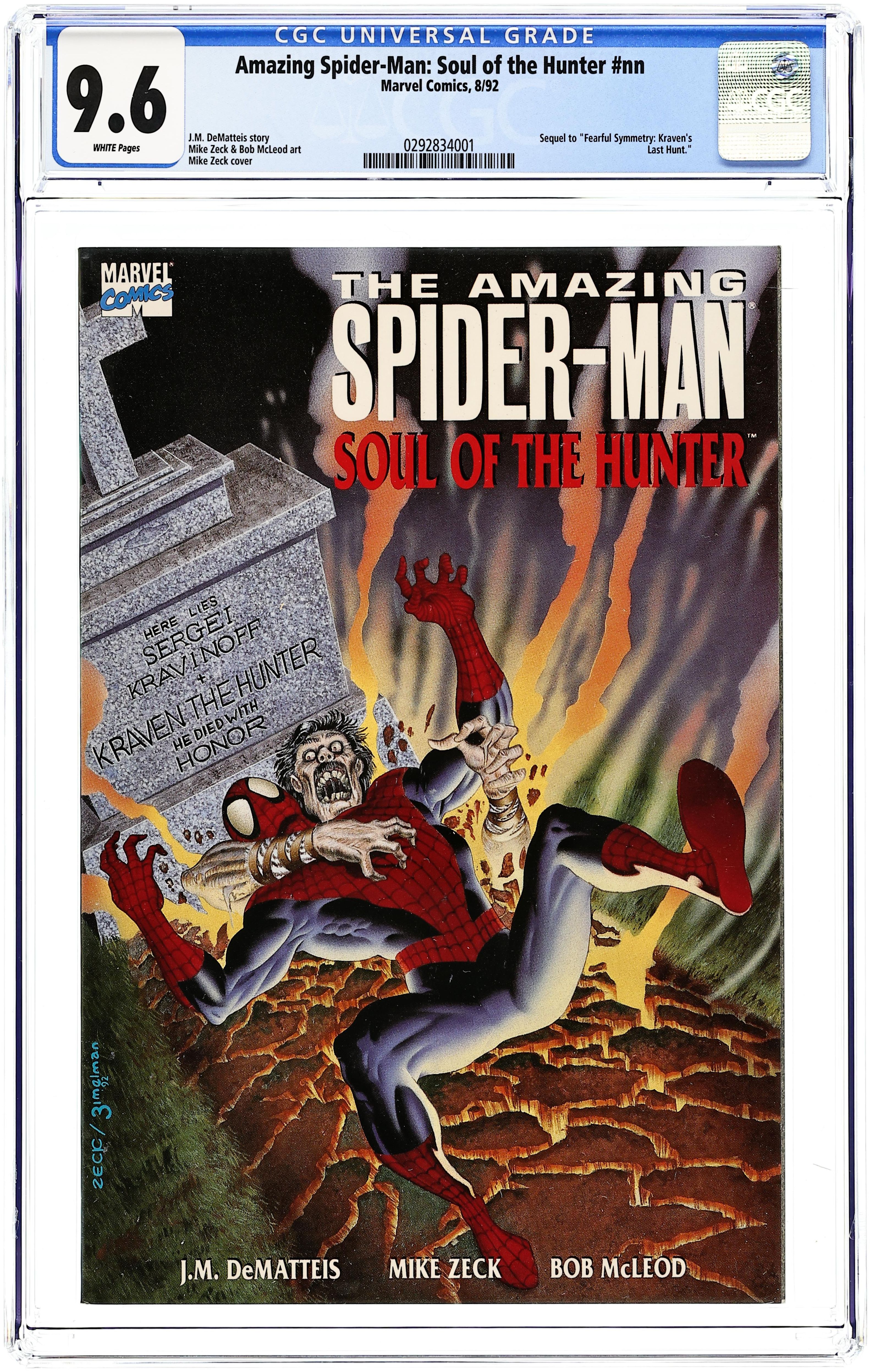 Soul of the Hunter - Written by J.M. DeMatteis. Art by Mike Zeck and Bob McLeod. Cover by Mike Zeck and Phil Zimelman. Death -- the final respite, the final rest. But not for Kraven the Hunter. His soul lingers, tortured, on the earthly plane. And only one man can release him from eternal torment. One man -- who wishes Kraven nothing but eternal torment. The amazing Spider-Man. In this sequel to the classic "Kraven's Last Hunt," the webslinger faces his greatest challenge: decline to fight for Kraven, and he risks losing his own humanity. Fight for Kraven and lose...and risk forfeiting his own soul. J.M. DeMatteis, Mike Zeck and Bob McLeod combine their talents to bring you a tale even more shattering than their original work on Last Hunt. And nothing will ever again be the same. 48 pages, full color. Cover price $5.95.