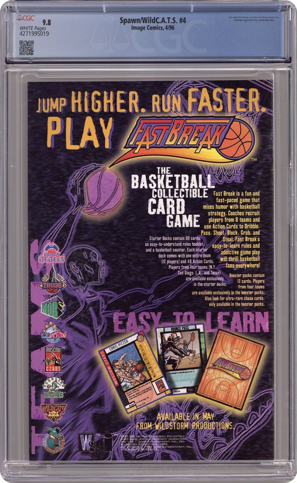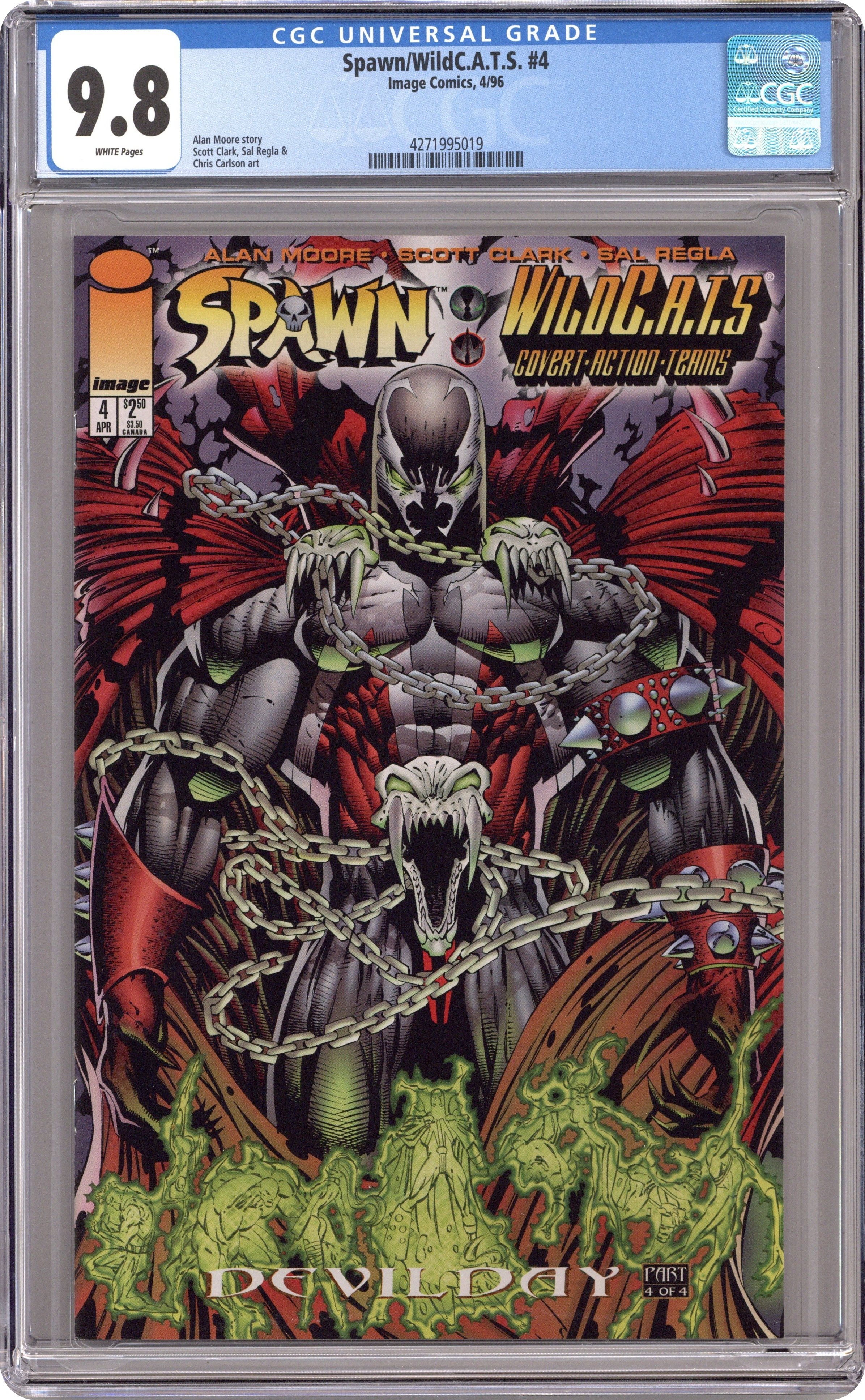 Cover pencils by Scott Clark, inks by Sal Regla. Untitled story, script by Alan Moore, pencils by Scott Clark, inks by Sal Regla; The future tyrant of Spawn (Simmons), Ipissimus, comes into the folds fighting his past self as well as the remaining WildC.A.T.s as they fall into killing some of their future selves to spare the suffering of Hell on Earth; Spawn is set back to the past with the very power source that lead him to the nightmare future he's witnessed. Returned to his timeline, Spawn is at a fated crossroads- does he continue his suffering a slave to Hell or does he take means to free himself at a cost of destroying the world? 36 pgs., full color. Cover price $2.50.