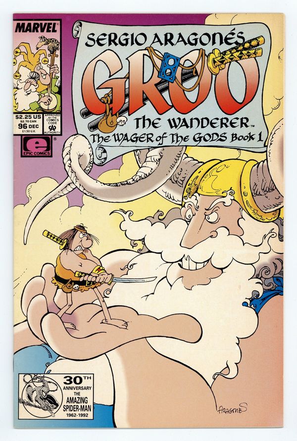 Comic featuring the humorous misadventures of the mighty but not-so-great (mentally) warrior named Groo. This issue features "The Wager of the Gods" book one in which Groo becomes involved in a competition amongst the gods as to whose hero is the greatest. Issue also has several one-page gag strips and a puzzle page. Story and art credits: Sergio Aragonés. Cover price $2.25.