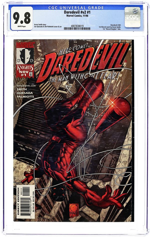Cover pencils by Joe Quesada, inks by Jimmy Palmiotti. Guardian Devil Part One: ...And A Child Shall Lead Them All, script by Kevin Smith, pencils by Joe Quesada, inks by Jimmy Palmiotti; Karen has been gone for 6 months and Matt is trying to move on with his life; A young girl brings a child to Matt that she claims is the new Messiah and leaves the kid in his care. 38 pgs. $2.50. Cover price $2.50.