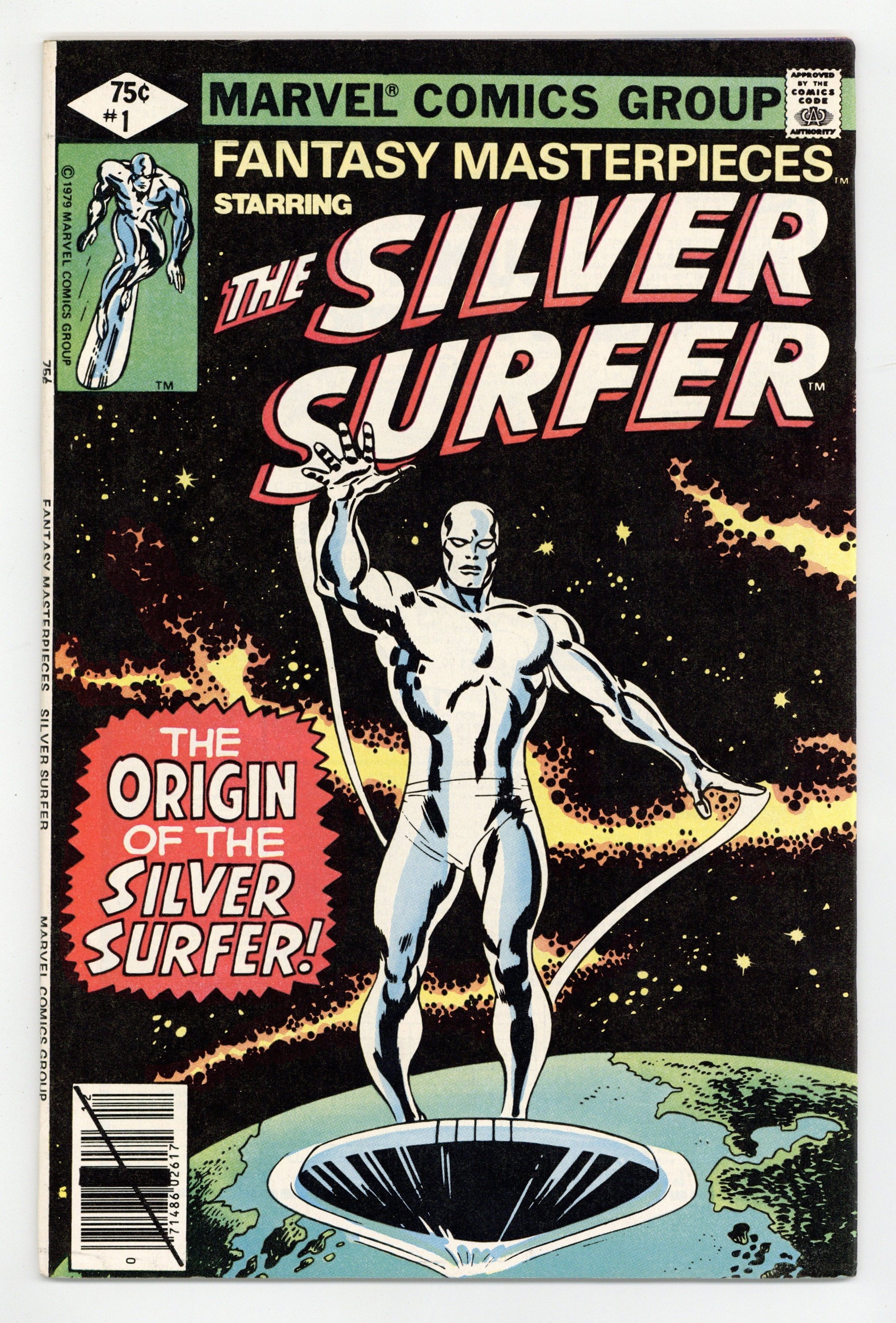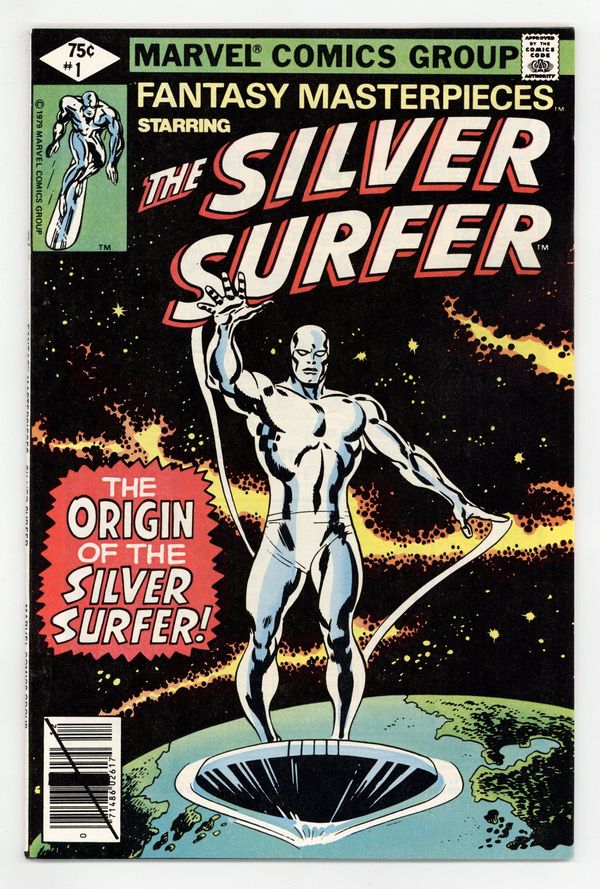 Direct Edition. Reprints Silver Surfer (1969 1st Series) #1. "The Origin of the Silver Surfer!" Cameos by the Incredible Hulk, Doctor Doom, and the Fantastic Four. Written by Stan Lee. Art by John Buscema and Joe Sinnott. Many years ago, in order to prevent the total annihilation of his civilization and homeworld, Norrin Radd bargained with the Devourer of Worlds. Imbued with the Power Cosmic, he became the Silver Surfer and Herald of Galactus. However, on the fateful day he arrived on Earth, for love of humanity, he betrayed his master, and thus was cursed to never traverse the space-ways again. This is his story. Cover price $0.75.
