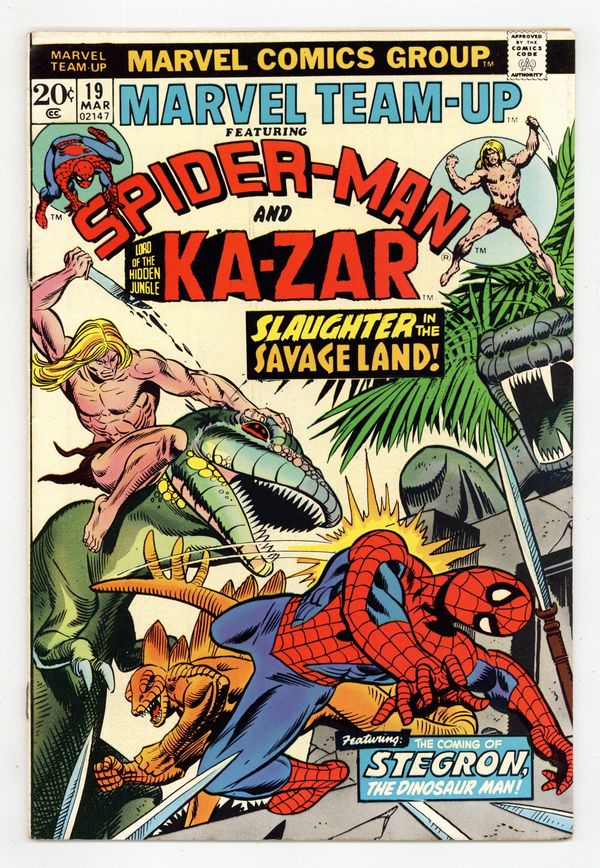 Spider-Man and Ka-Zar in "The Coming of Stegron the Dinosaur Man!" Part 1 of 2. Script by Len Wein. Pencils by Gil Kane. Inks by Mike Esposito and Frank Giacoia. Cover by Gil Kane and Frank Giacoia. Spider-Man and Ka-Zar battle Stegron in the Savage Land. First appearance of Stegron. (The wall-crawler previously visited the Savage Land in Amazing Spider-Man 104. This issue was reprinted in Marvel Treasury Edition 22. The letters page contains Marvel Value Stamp Series A #90 Hercules.) Note: First appearance of Stegron. 36 pgs. Cover price $0.20.