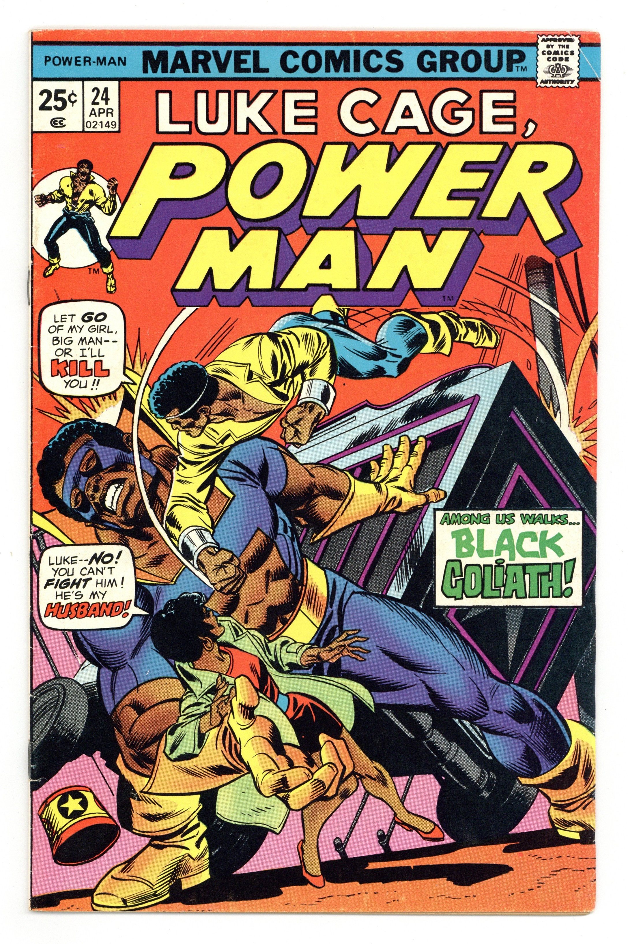 "Among us Walks...Black Goliath!" Part 1 of 2. Guest-starring Goliath (Bill Foster). Script by Tony Isabella, pencils by George Tuska, inks by Vince Colletta. Luke Cage meets Claire's ex-husband, Dr. Bill Foster, former lab assistant to Hank Pym (Giant Man) and the super hero known as Goliath. And, the big man isn't too happy when he finds the woman he still loves in the arms of another man. Everyone knows what follows next...super-hero tussle in the mighty Marvel fashion. The letters page includes Marvel Value Stamp series A # 27 (the Black Widow). Gil Kane cover pencils. Cover price $0.25.