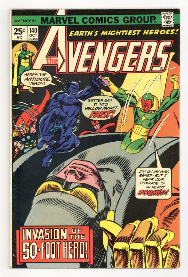 Tags: Marvel Legacy Numbering: Avengers (part 140), Avengers$16.50"A Journey to the Center of the Ant" Part 2 of 2. Script by Steve Englehart. Pencils by George Tuska. Inks by Vince Colletta. Cover by Gil Kane and Mike Esposito. Yellowjacket has collapsed on the street outside the hospital following last issue's battle! And now his body is growing with every passing second! Fortunately though, the Beast has a plan to save Hank Pym! First, get a special serum from Hank McCoy's old laboratory at the Brand Corporation; and second, get the serum inside Yellowjacket as soon as possible! The Beast can handle step one, but who will take care of step two? The incomparable Vision! And in an awesome reversal of events from the classic Avengers 93, the synthezoid avenger enters the body of Hank Pym! Avengers Lineup: Beast, Iron Man, Moondragon, Scarlet Witch, Thor, Vision, Wasp, and Yellowjacket. Cameo appearance by Patsy Walker. 36 pages Cover price $0.25.