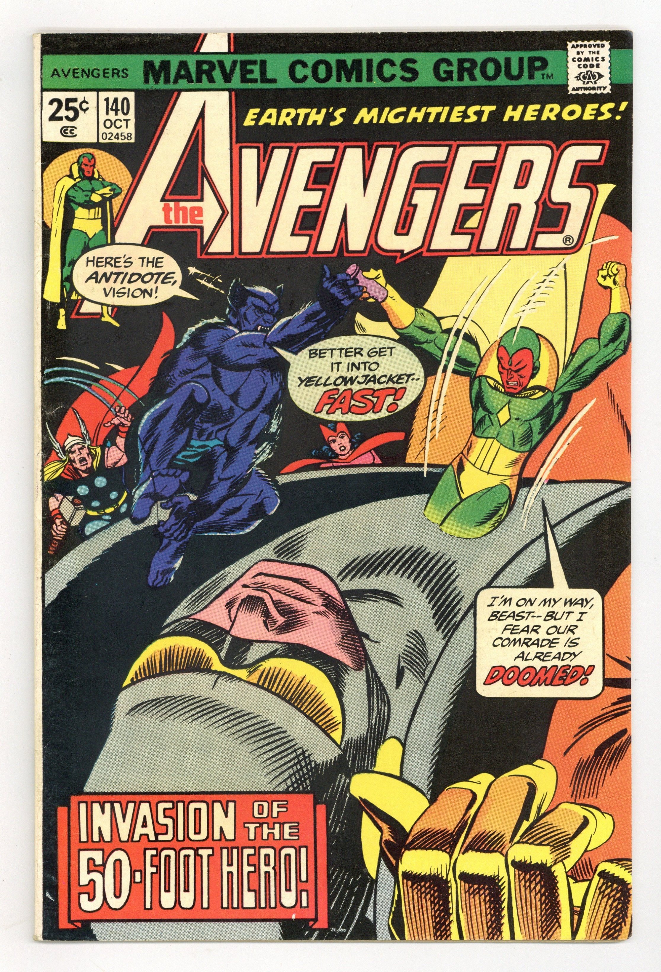 "A Journey to the Center of the Ant" Part 2 of 2. Script by Steve Englehart. Pencils by George Tuska. Inks by Vince Colletta. Cover by Gil Kane and Mike Esposito. Yellowjacket has collapsed on the street outside the hospital following last issue's battle! And now his body is growing with every passing second! Fortunately though, the Beast has a plan to save Hank Pym! First, get a special serum from Hank McCoy's old laboratory at the Brand Corporation; and second, get the serum inside Yellowjacket as soon as possible! The Beast can handle step one, but who will take care of step two? The incomparable Vision! And in an awesome reversal of events from the classic Avengers 93, the synthezoid avenger enters the body of Hank Pym! Avengers Lineup: Beast, Iron Man, Moondragon, Scarlet Witch, Thor, Vision, Wasp, and Yellowjacket. Cameo appearance by Patsy Walker. 36 pages Cover price $0.25.