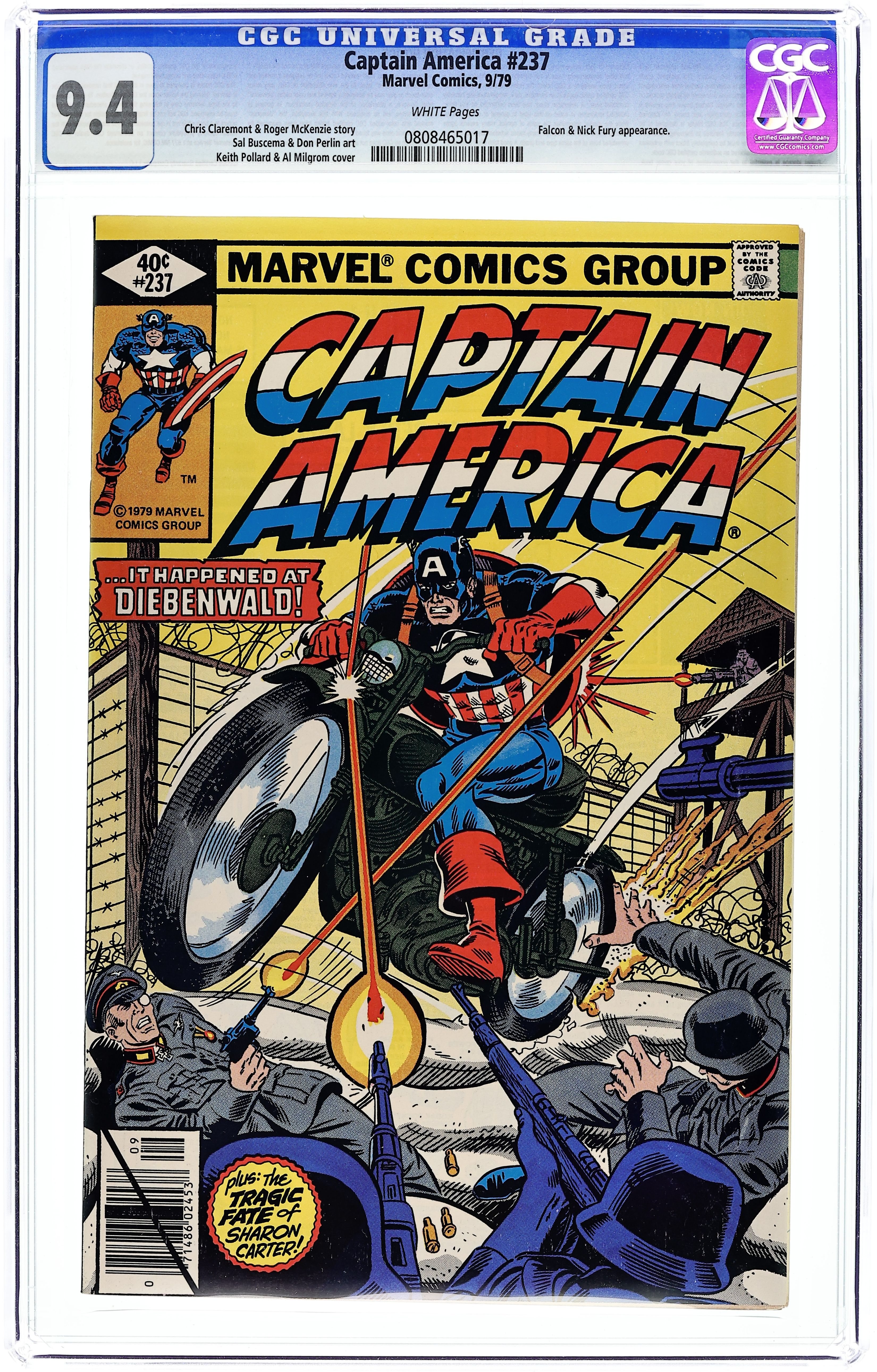 Direct Edition. "From The Ashes" Plot by Chris Claremont. Script by Roger McKenzie. Art by Sal Buscema (breakdowns) and Don Perlin (finishes). Cover by Keith Pollard and Al Milgrom. In a heartbreaking moment, Captain America views a news videotape -- that confirms Sharon Carter's fiery death four issues ago. After watching the tape, the devastated shield-slinger decides that it's time to make changes to his personal life. So Steve Rogers begins a new career as a commercial artist and moves into a townhouse in Brooklyn Heights. At his new townhouse, Steve meets an elderly resident named Anna Kapplebaum. They seem to have met somewhere before...decades ago...under the direst circumstances. Cameo appearances by Peter Parker, Nick Fury, the Beast, Falcon, Ms. Marvel, Vision, and the Wasp. 36 pages. Cover price $0.40.