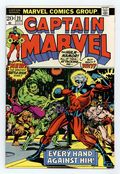 Tags: Thanos: The Final Threat (part 2)$18.75Cover pencils by Jim Starlin, inks by Joe Sinnott. Captain Marvel battles the Super-Skrull (in the guise of Ronan, Megaton, Yon-Rogg, the Hulk, and the Sub-Mariner) in "A Taste of Madness!", script by Mike Friedrich, pencils by Jim Starlin (first work on the series), inks by Chic Stone; In an elaborate scheme of the Skrulls and their mysterious Masterlord, Super-Skrull and Kl'rt, Rick Jones is framed for the murder of Dr. Benjamin Savannah and brought to a run-down police precinct; Using Super-Skrulls invisibility as well as other Skrull technology, Mar-Vell and Rick are led to believe that many of his long-time friends and foes have returned and are attacking him; Rick and Mar-Vell identify the ruse, and Mar-Vell attacks the Skrulls; The building collapses in the battle and the Skrulls escape. 36 pgs., full color. Cover price $0.20.