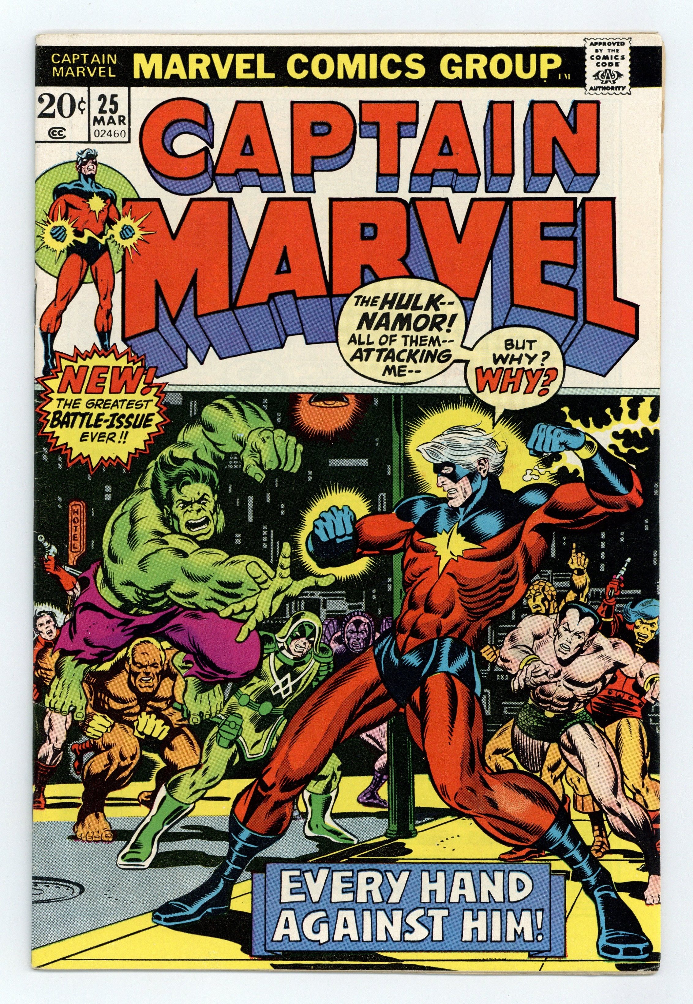 Cover pencils by Jim Starlin, inks by Joe Sinnott. Captain Marvel battles the Super-Skrull (in the guise of Ronan, Megaton, Yon-Rogg, the Hulk, and the Sub-Mariner) in "A Taste of Madness!", script by Mike Friedrich, pencils by Jim Starlin (first work on the series), inks by Chic Stone; In an elaborate scheme of the Skrulls and their mysterious Masterlord, Super-Skrull and Kl'rt, Rick Jones is framed for the murder of Dr. Benjamin Savannah and brought to a run-down police precinct; Using Super-Skrulls invisibility as well as other Skrull technology, Mar-Vell and Rick are led to believe that many of his long-time friends and foes have returned and are attacking him; Rick and Mar-Vell identify the ruse, and Mar-Vell attacks the Skrulls; The building collapses in the battle and the Skrulls escape. 36 pgs., full color. Cover price $0.20.