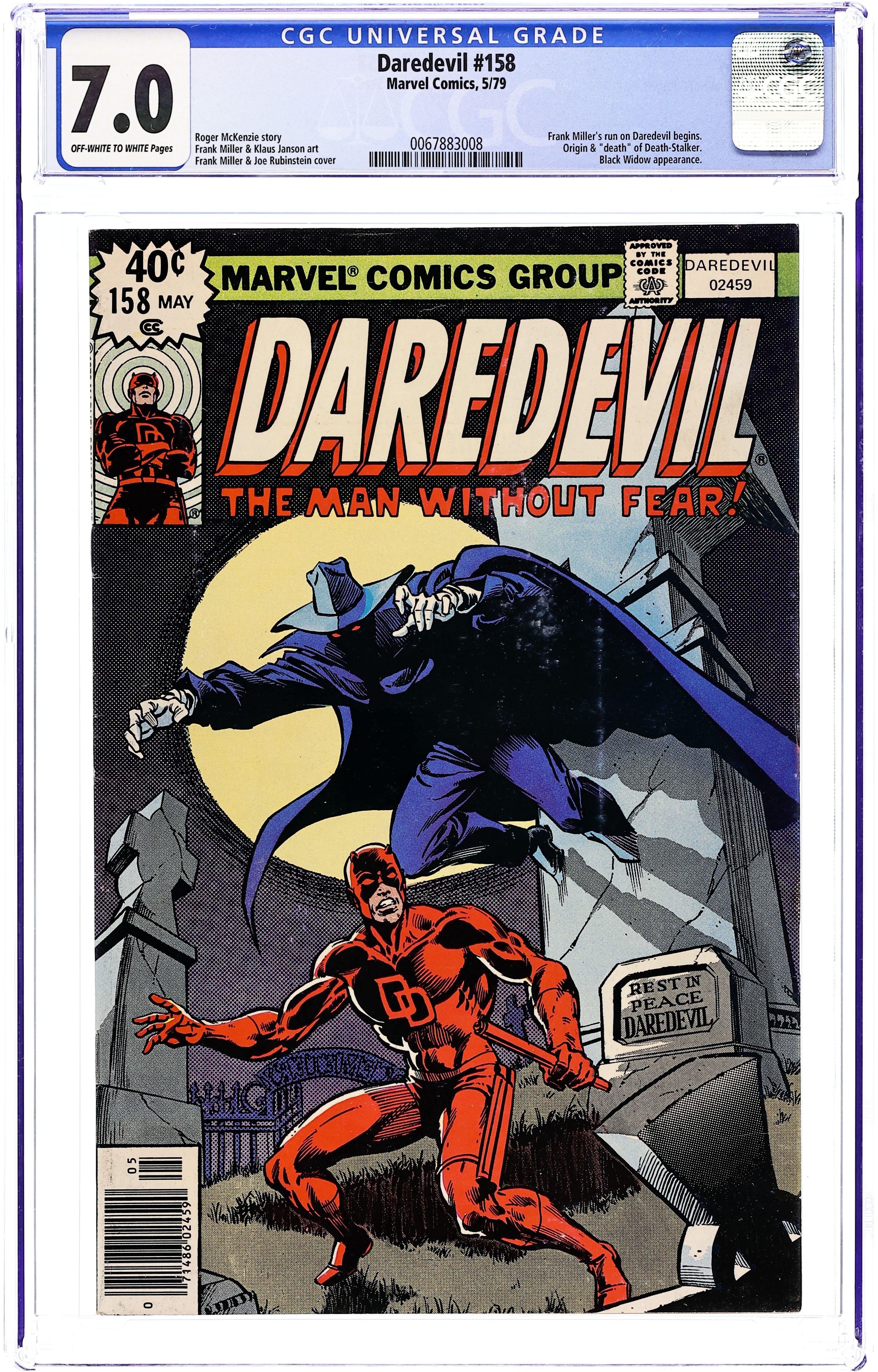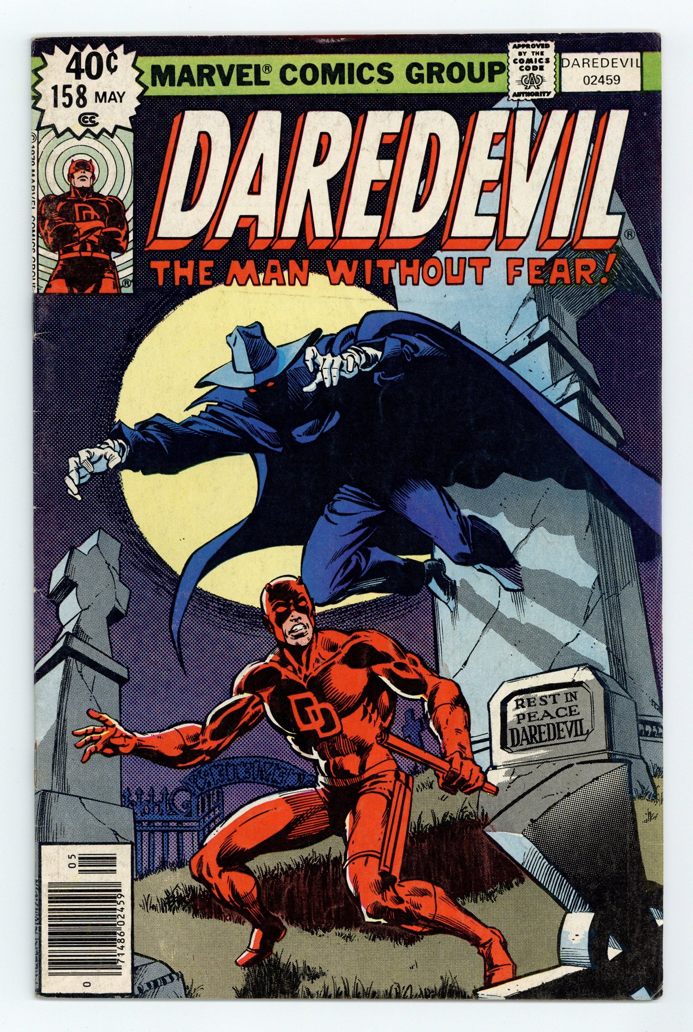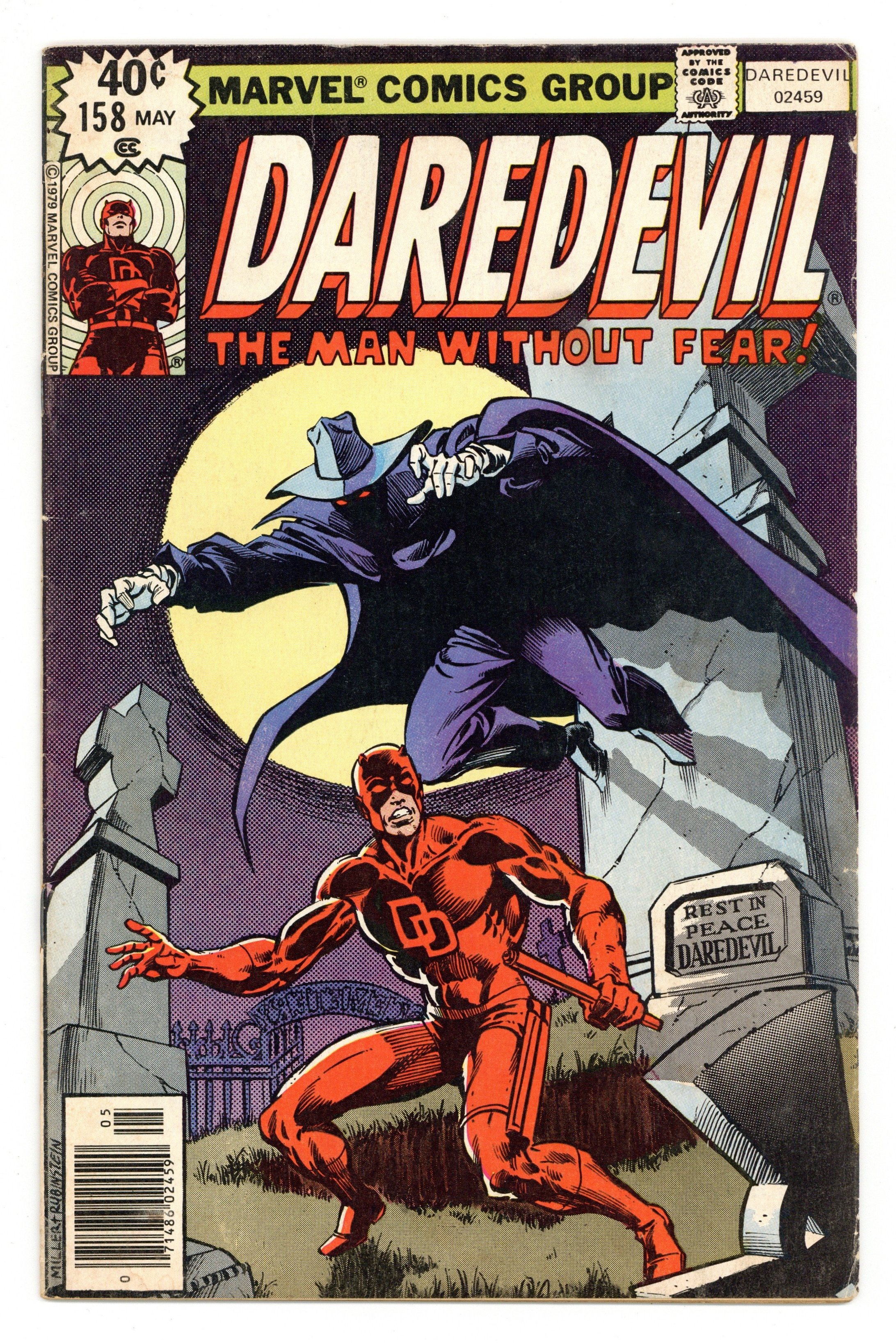 First Frank Miller Daredevil. First 40-cent cover price. Cover pencils by Frank Miller, inks by Joe Rubinstein. A Grave Mistake!, script by Roger McKenzie (Death-Stalker origin on page 7 plotted by Marv Wolfman), pencils by Frank Miller , inks by Klaus Janson.; Matt is captured by the Ani-Men and has a final showdown with Death-Stalker in a graveyard; the Unholy Three (Ape Man, Bird Man, Cat Man) appear. This issue contains a statement of ownership--average print run 393,978; average paid circulation 111.559. Miller/Joe Rubinstein cover. 36 pgs. Cover price $0.40. Cover price $0.40.