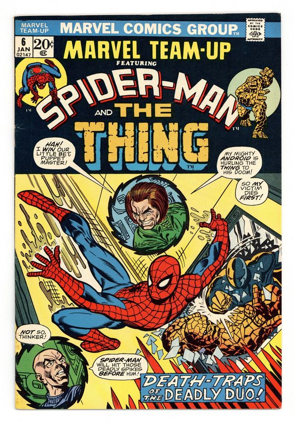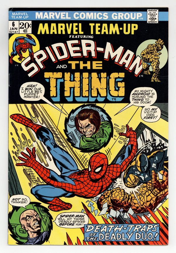 Tags: Fantastic Four, Spider-Man$12.50"As Those Who Will Not See!" Guest-starring Spider-Man and the Thing. Script by Gerry Conway. Pencils by Gil Kane. Inks by Mike Esposito. Cover by Gil Kane, Mike Esposito, and Frank Giacoia. The web-slinger is cleaning up the Baxter Building following last issue's battle, when Ben Grimm and his girlfriend return home. The Thing immediately sees the Puppet Master and wants to talk to him! Phillip Masters says he might be able to restore Alicia's eyesight at his old Pennsylvania laboratory. So Ben, Alicia, Spider-Man, and the Puppet Master fly to the Keystone State in the fantasti-car. But Alicia's step-father has a very thoughtful accomplice hiding in his old lab! Can the wall-crawler and the idol of millions avoid disaster vs. the Mad Thinker and Puppet Master? Origin of the Puppet Master. (Notes: This story explains how Phillip Masters came to be Alicia's stepfather. The Puppet Master returns in Marvel Two-in-One #9. The Mad Thinker appears next in Iron Man #74. This issue was reprinted in Marvel Treasury Edition #13.) 36 pages. Cover price $0.20.
