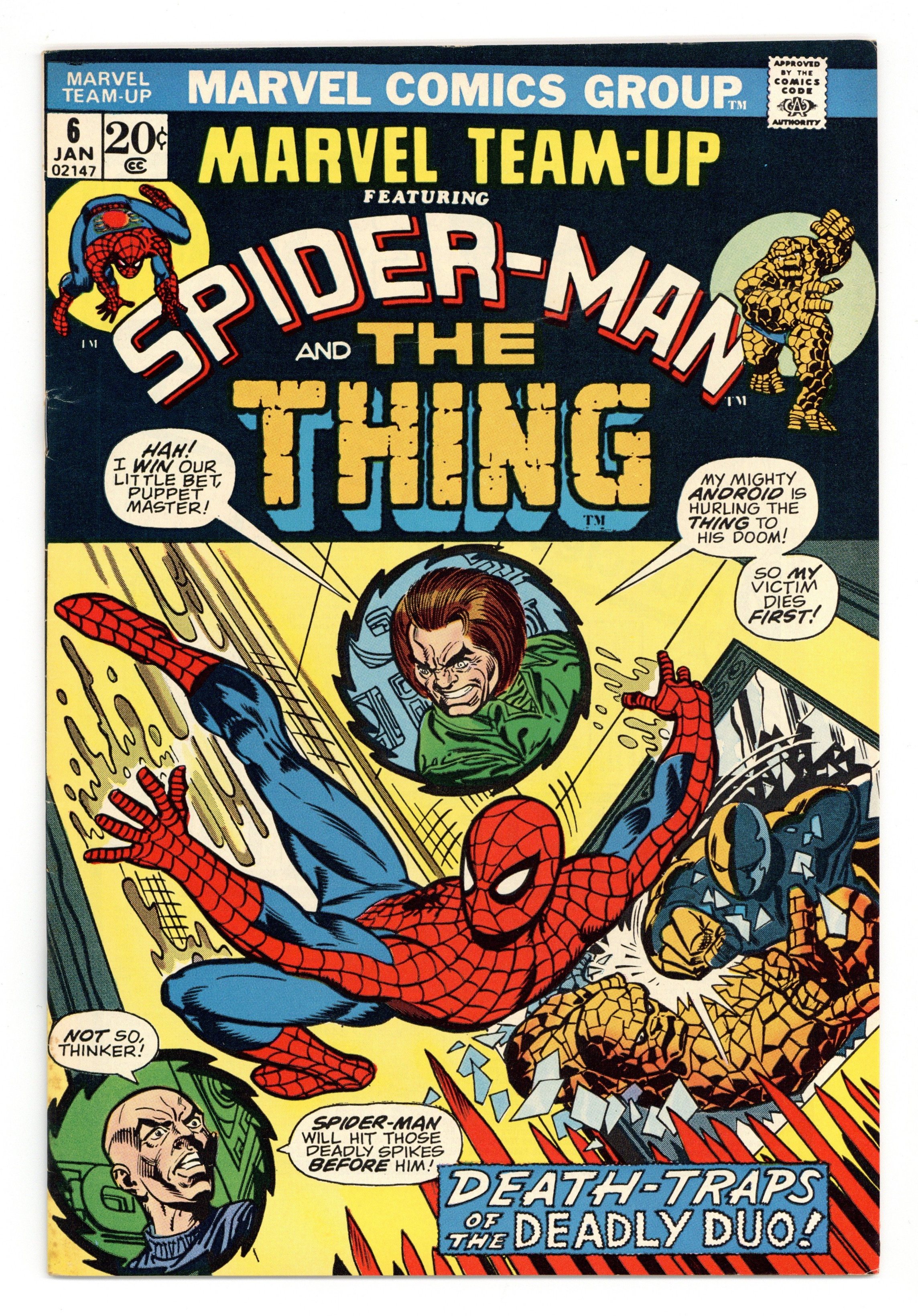"As Those Who Will Not See!" Guest-starring Spider-Man and the Thing. Script by Gerry Conway. Pencils by Gil Kane. Inks by Mike Esposito. Cover by Gil Kane, Mike Esposito, and Frank Giacoia. The web-slinger is cleaning up the Baxter Building following last issue's battle, when Ben Grimm and his girlfriend return home. The Thing immediately sees the Puppet Master and wants to talk to him! Phillip Masters says he might be able to restore Alicia's eyesight at his old Pennsylvania laboratory. So Ben, Alicia, Spider-Man, and the Puppet Master fly to the Keystone State in the fantasti-car. But Alicia's step-father has a very thoughtful accomplice hiding in his old lab! Can the wall-crawler and the idol of millions avoid disaster vs. the Mad Thinker and Puppet Master? Origin of the Puppet Master. (Notes: This story explains how Phillip Masters came to be Alicia's stepfather. The Puppet Master returns in Marvel Two-in-One #9. The Mad Thinker appears next in Iron Man #74. This issue was reprinted in Marvel Treasury Edition #13.) 36 pages. Cover price $0.20.