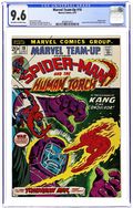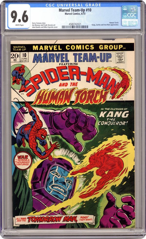 "Time Bomb!" Part 2 of 3. Guest-starring Spider-Man and the Human Torch. Script by Gerry Conway. Pencils by Jim Mooney. Inks by Frank Giacoia. Cover by John Romita and Mike Esposito. At the hands of Kang the Conqueror, the wall-crawler and Iron Man have gone down to defeat in the 23rd century. Kang adds Shell-head to his collection of captured avengers, while Spider-Man finds the time portal and escapes back to 1973! Unfortunately, Zarrko, the Tomorrow Man has planted three reverse-time radiation bombs in Japan, Greece, and Venezuela -- which must be disarmed! So the web-slinger enlists the aid of Johnny Storm to foil Zarrko's master plan! Will the Human Torch and Spider-Man complete their globe-trotting mission in time? And who will rescue the Avengers three hundred years in the future? Cameo appearances by Jarvis, Captain America, Iron Man, Scarlet Witch, Thor, and the Vision. (Note: This issue was published the same month as the classic Amazing Spider-Man 121.) 36 pages. Cover price $0.20.