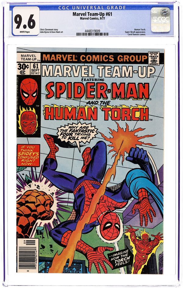 "Not All Thy Powers Can Save Thee!" Part 1 of 2. Guest-starring Spider-Man and the Human Torch. Script by Chris Claremont. Pencils by John Byrne. Inks by Dave Hunt. Cover by Al Milgrom and Joe Sinnott. The wall-crawler is cleaning up Reed Richards' laboratory after last issue's battle, when he is abruptly attacked by the Fantastic Four (or someone closing resembling them)! What is going on? One thing leads to another...and it's another classic team-up of the Spectacular Spider-Man and the Human Torch! At the west side rail yards, the web-slinger and the torch throw down with the Super-Skrull, while Captain DeWolff rallies New York's finest! Can the Super-Skrull be stopped? Cameo appearance by Carol Danvers (aka Ms. Marvel) Flashback cameo by Tigra. (Notes: The Super Skrull previously appeared in Marvel Chillers 7. This two-part story was reprinted in Marvel Tales 195 and 196. A 35-cent cover price variant exists for this issue.) 36 pages' Cover price $0.30.
