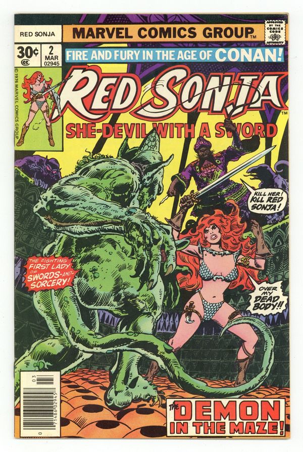 $6.30Cover by Frank Thorne. The Demon of the Maze, script by Roy Thomas and Clara Noto, art by Frank Thorne; Red Sonja comes to the port city of Venzia in the kingdom of Argos; After witnessing two sailing vessels crashing into one another, she rescues a young woman from a couple of street brigands; Moments later, a mute thug clobbers Sonja across the back of the head and brings her to the dungeon of a mage known as the Hidden One; When Sonja awakens, she finds herself trapped in a strange maze of mirrors and illusions. Spider-Man stars in a one-page Hostess ad, "The Champ." 36 pgs., full color. $0.30. Cover price $0.30.
