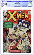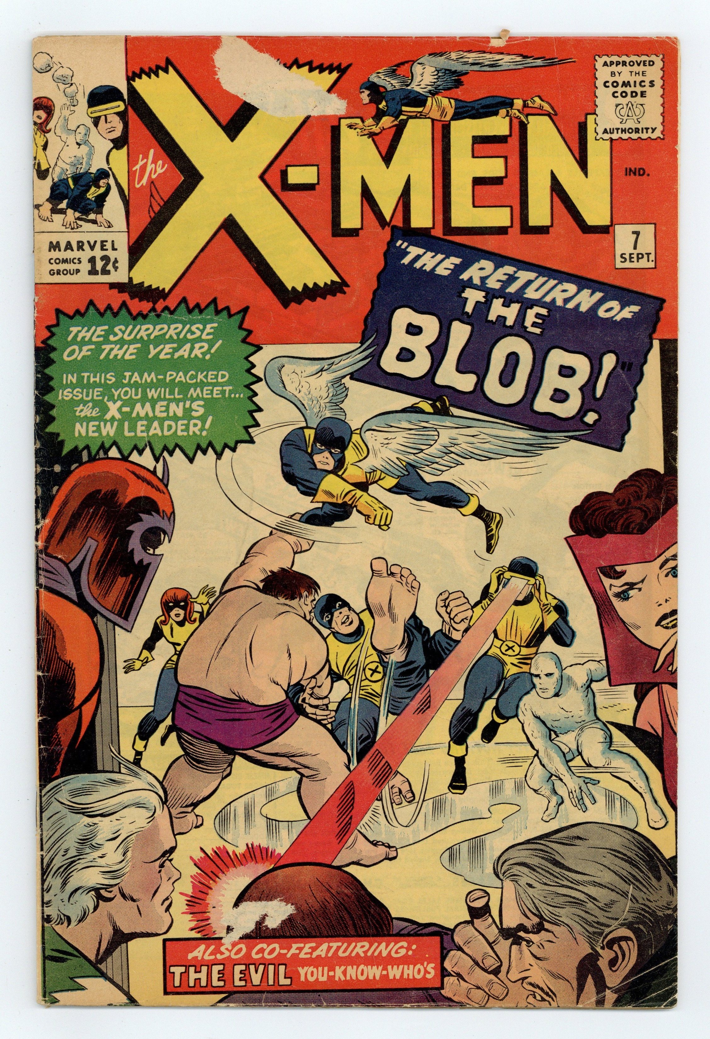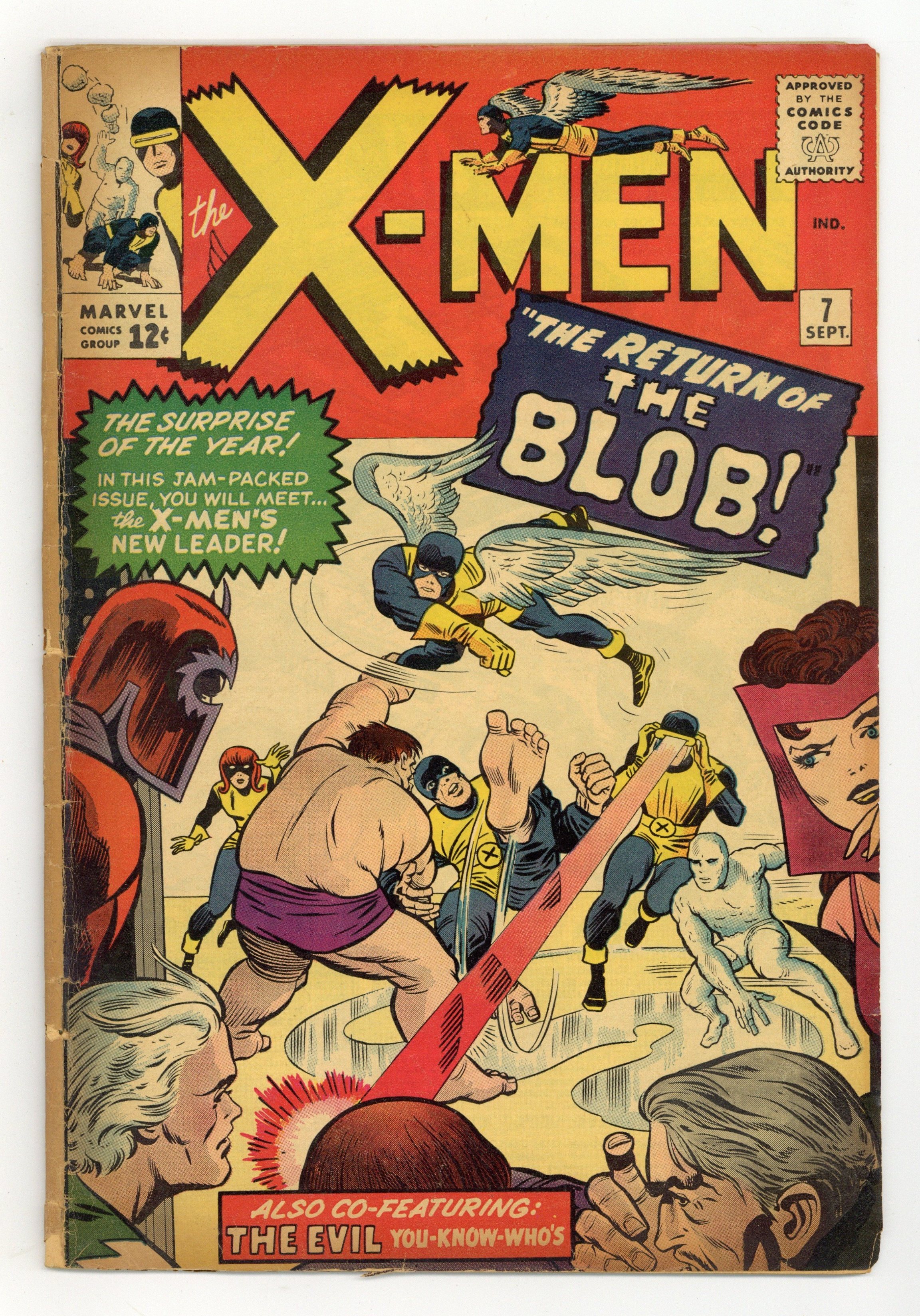 Cover pencils by Jack Kirby, inks by Chic Stone. The Return of the Blob, script by Stan Lee, pencils by Jack Kirby, inks by Chic Stone; The X-Men graduate from Xavier's school and the Professor tells them that he is taking a leave of absence; He puts Cyclops in charge while he is away and shows him his new mutant detecting machine, Cerebro; Magneto tracks down the Blob and invites him to join the Brotherhood; During a scuffle, Xavier's mental blocks dissolve and Blob remembers the secret of the X-Men; As this happens, the Blob's name lights up on Cerebro and Scott calls the X-Men away from a day of relaxation and back to battle with the evil mutants; During the battle with the Brotherhood, Magneto shoots missiles at the X-Men, even though the Blob is in the line of fire, and the hefty mutant, feeling betrayed, decides to return to carnival life. 1st appearance of Cerebro. 36 pgs. $0.12. Cover price $0.12.