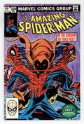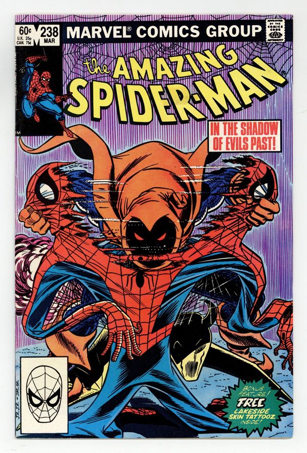 IMPORTANT: Issue 238B DOES NOT come with Lakeside Skin Tattooz (insert may be present, but tattoo is missing either way). Direct Edition. First appearance of the Hobgoblin in "Shadow of Evils Past!" Script by Roger Stern. Art by John Romita Jr. (breakdowns) and John Romita Sr. (finishes). Cover by John Romita Jr. and John Romita Sr. One of the landmark issues of the Amazing Spider-Man! And the beginning of the long secret identity mystery of the Hobgoblin! After escaping from the web-slinger, a bank robber stumbles upon an underground hideout of the (deceased) Green Goblin! Not knowing what to do with his discovery, the small-time hood shows the secret lair to an underworld associate! Unfortunately for the wondrous wall-crawler, the devious associate knows exactly what to do: resurrect the Green Goblin...with a twist! And a short time later a new super-villain is born! The Hobgoblin! Cameo appearance by Mary Jane Watson. Flashback cameo by Norman Osborn (aka the Green Goblin). (Notes: The secret identity of the original Hobgoblin takes many twists and turns over the next decade. Who actually operates as the Hobgoblin in this issue is revealed in the Spider-Man: Hobgoblin Lives (1997) Limited Series (written by Roger Stern). This issue was reprinted in Marvel Tales 257 and also in the 1992 trade paperback: the Amazing Spider-Man -- Origin of the Hobgoblin.) 36 pages. Cover price $0.60.