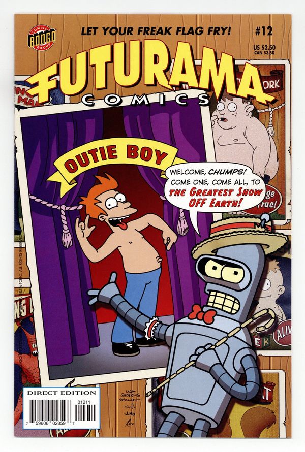 by Rogers & Delaney Fry, Leela, Bender, and Zoidberg are taken for sideshow freaks, literally, in a traveling intergalactic circus. Bender has dreams of center ring stardom, and Fry finds what would appear to be the love of his life...with the Bearded Lady. FC, 32pg $2.50 Cover price $2.50.
